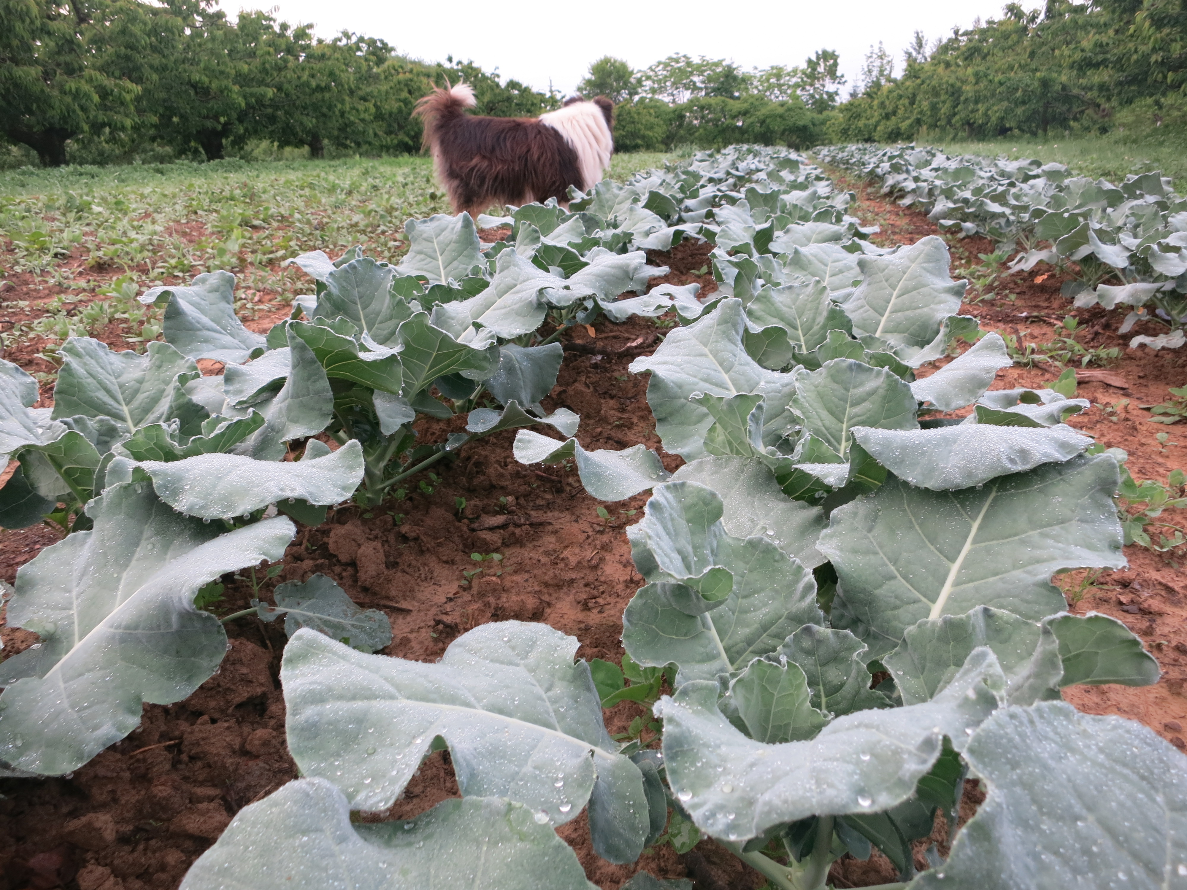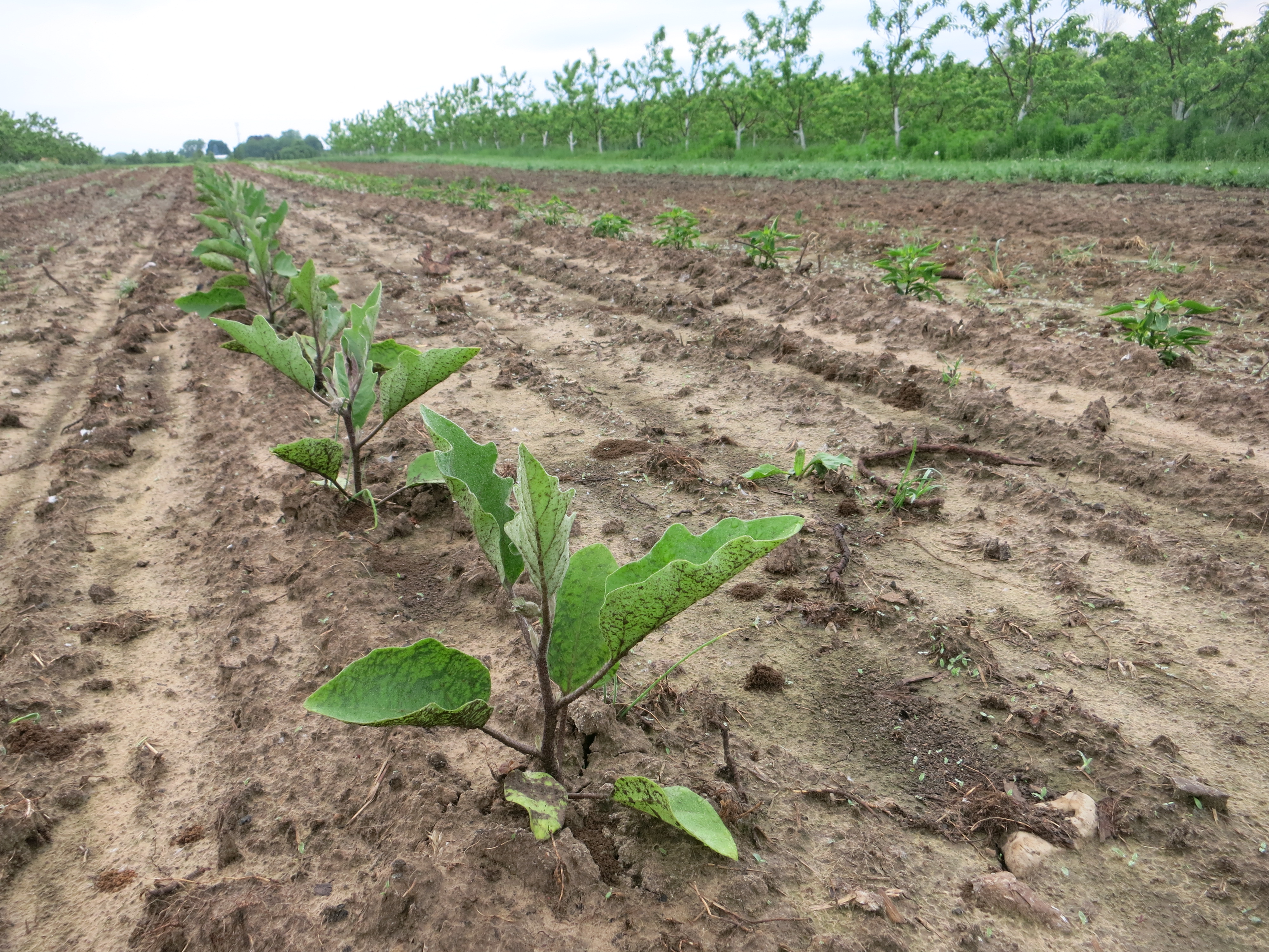 The recent downpours have left the eggplant & peppers dirty. We’ll cultivate them a few times to encourage quicker growth, then mulch them.