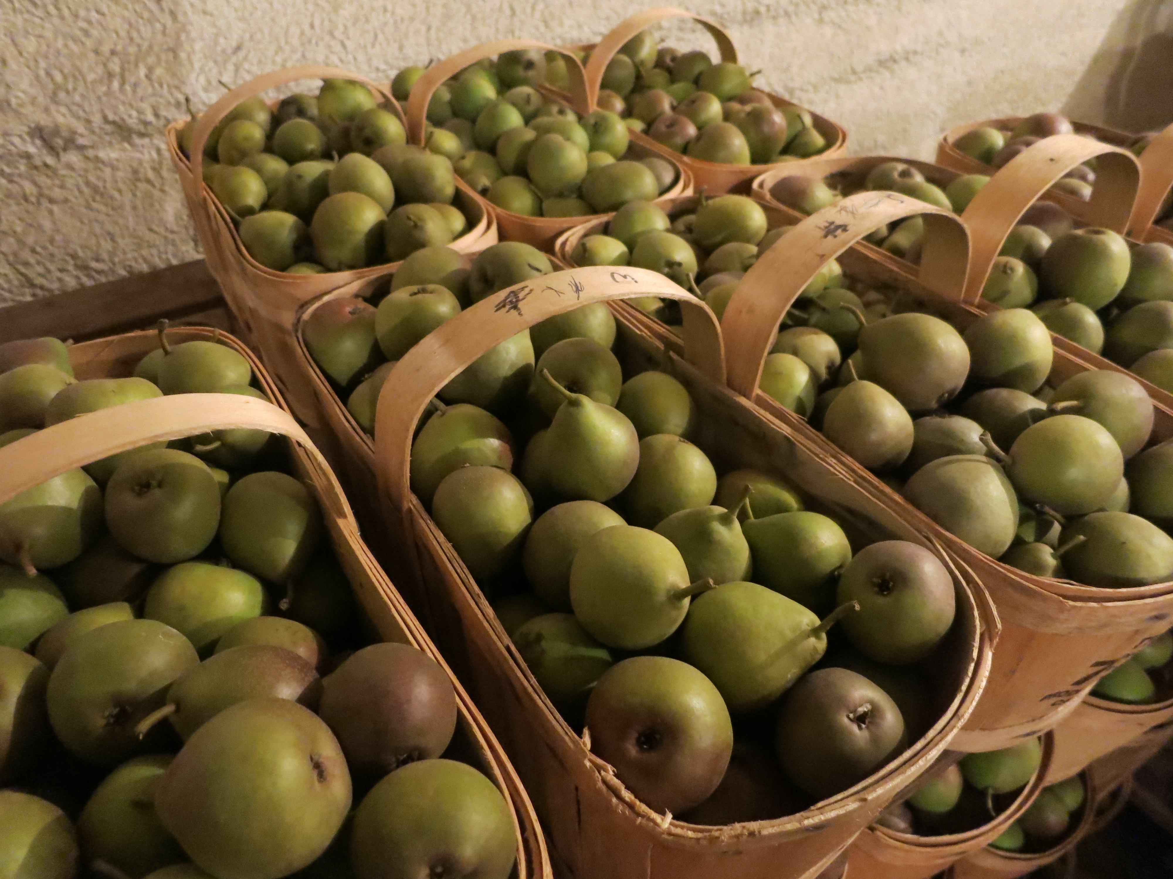 Harrow Delight & Harvest Queen are picked first. They are small pears, best eaten when still crunchy.