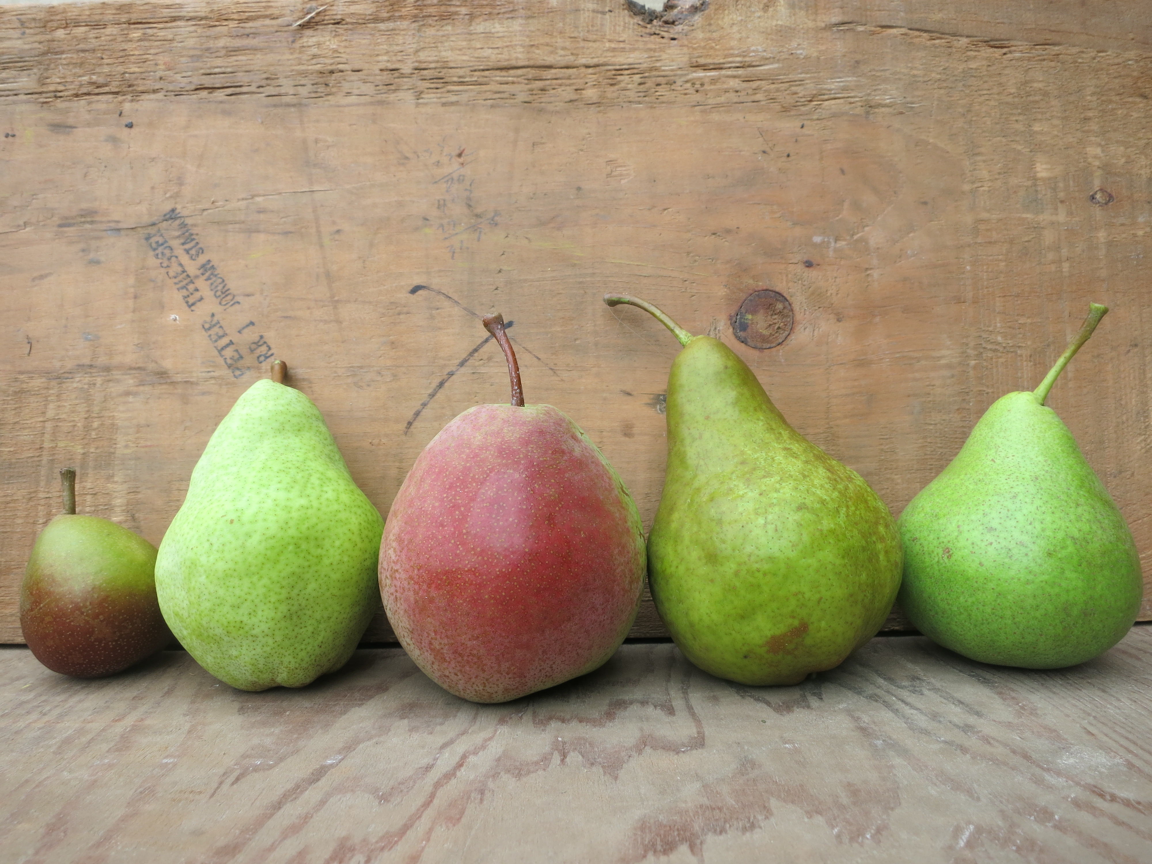 (from left to right) Seckel, Bartlett, Flemish Beauty, Bosc and Harrow Sweet.