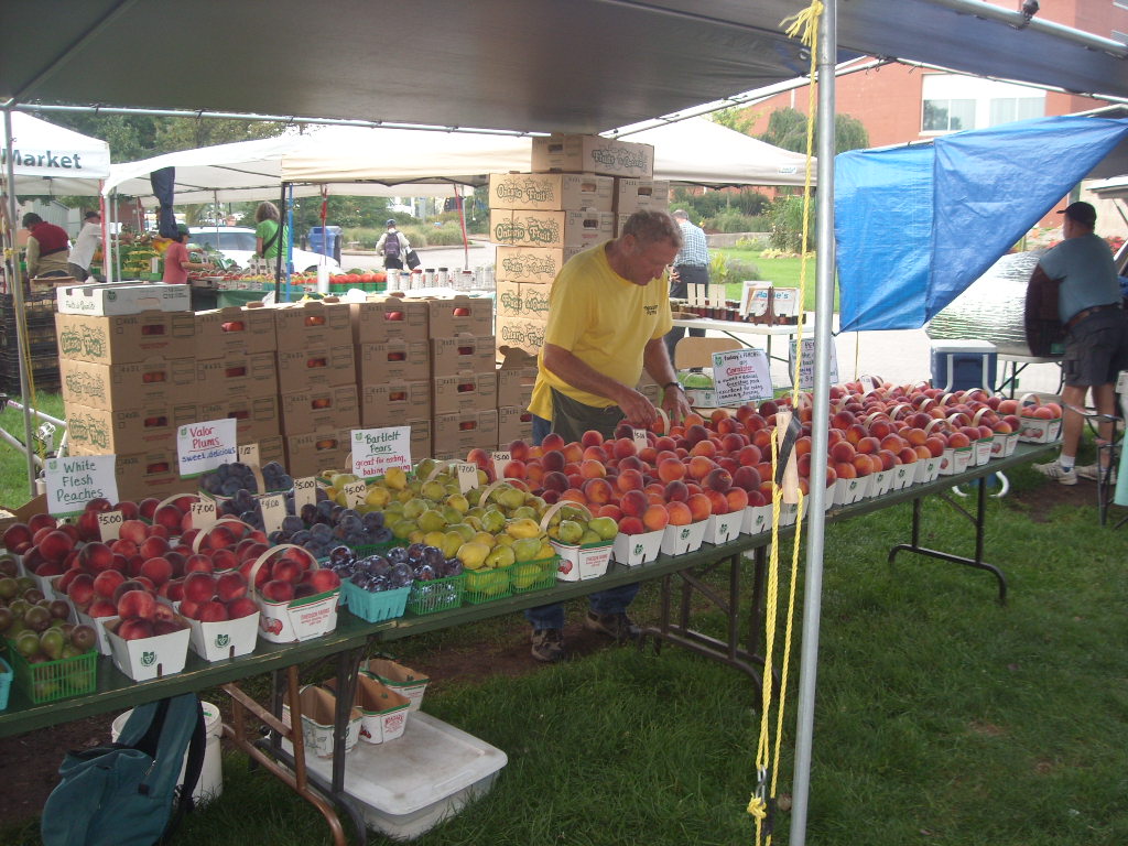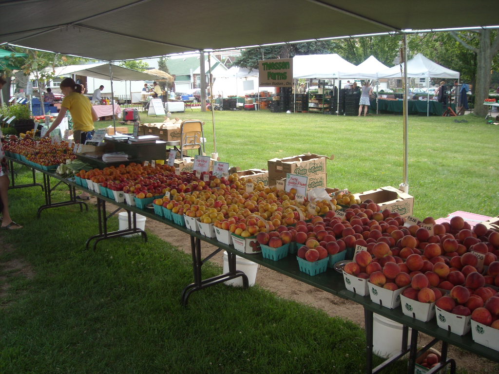 One of the biggest pleasures of  selling at a farmers’ market is getting to know the people who eat our fruit & vegetables … the guy who can hardly wait for the white flesh peaches, the couple needing Damsons for their favourite plum torte recipe, and Lynne who lives for our green zebra tomatoes. We know who always squeezes the peaches, who will try to pick through the heirloom tomatoes looking for all the purple calabash, and who will dare to buy that hefty blue hubbard squash that others only gaze at in awe. Our friends wonder how the crops are coming in, ask if we’ve had enough rain, and worry about the hailstorm they heard about. They tell us how much sweeter the peaches are getting each week, and share a recipe they tried using our eggplant. We’re happy when Peter photographs our tables, satisfied when the discerning chef chooses our fruit for the party he’s catering, and proud that our vegetables will be on morning television with Mairlyn …