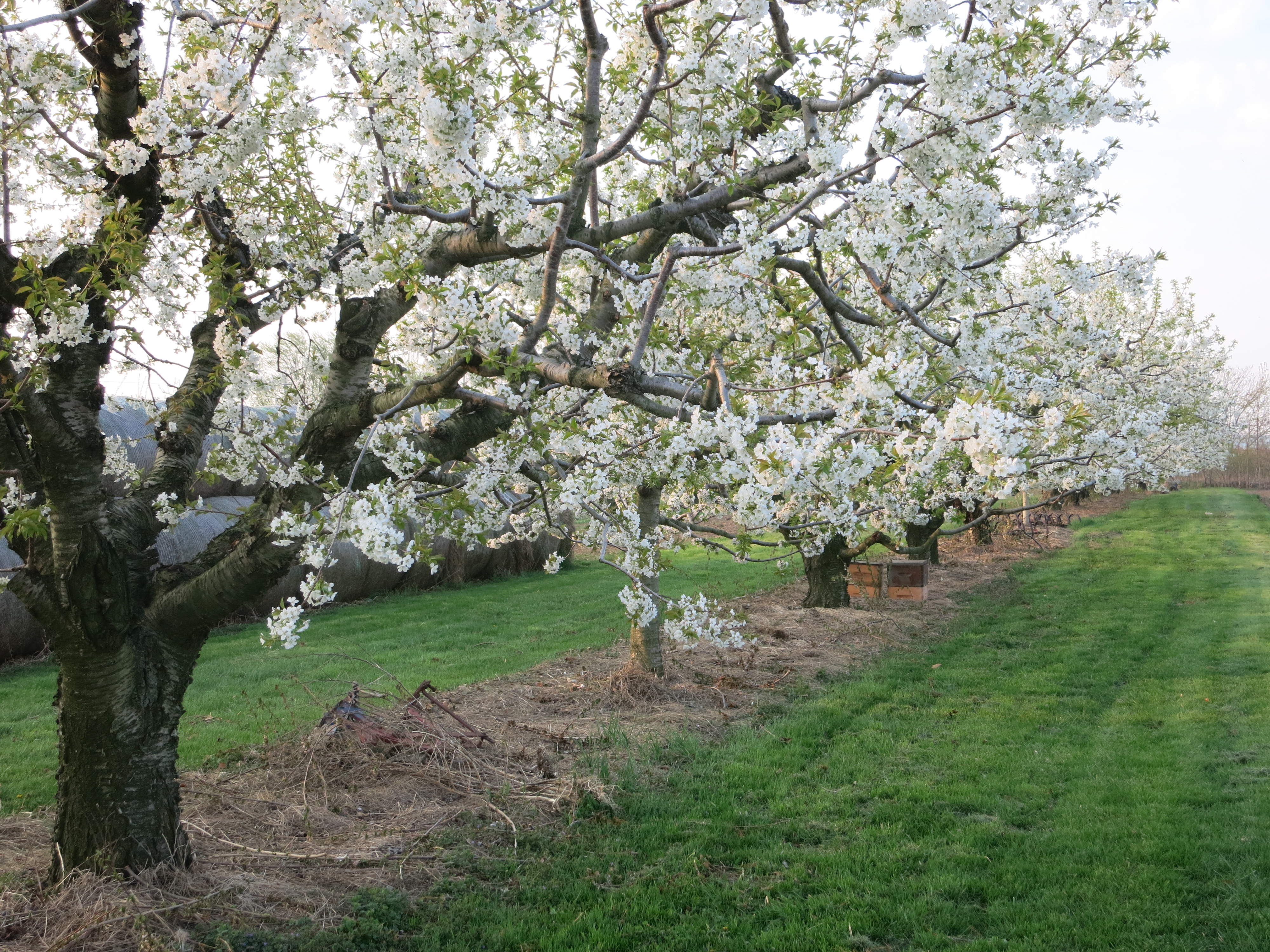 Blossom time went by quicker this season. Last weekend the cherries, plums & peaches were at their peak, but the sunny, hot & humid weather meant they did not last long. It was perfect weather for the bees to do their work though, and pollinate the blossoms – and they were out in force.