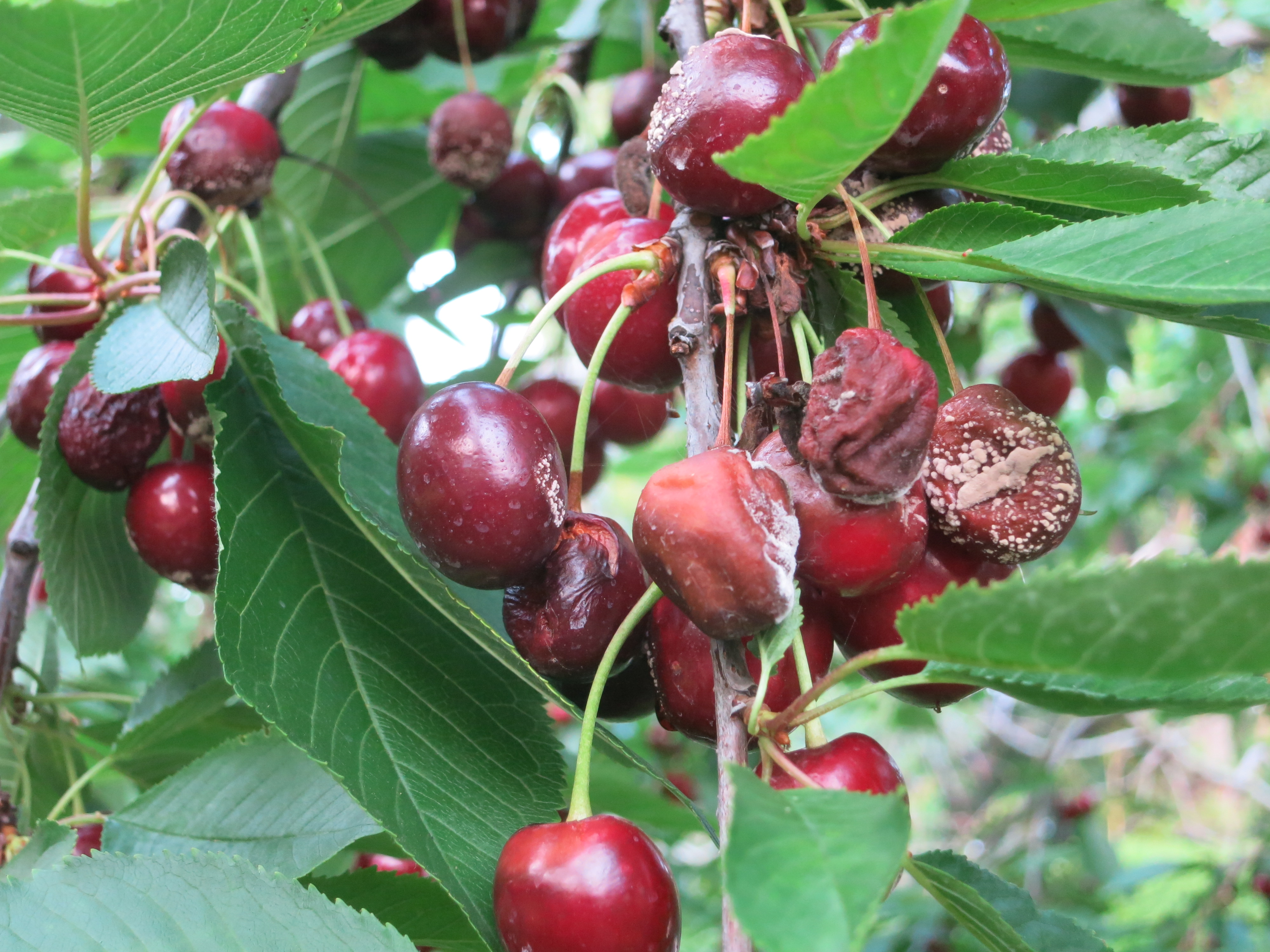 Where the crop is lighter & the cherries less plentiful, there is not as much ruined fruit. We applied fungicides to try to stop the fruit from spoiling as well. Without these sprays there would be no edible fruit at all!