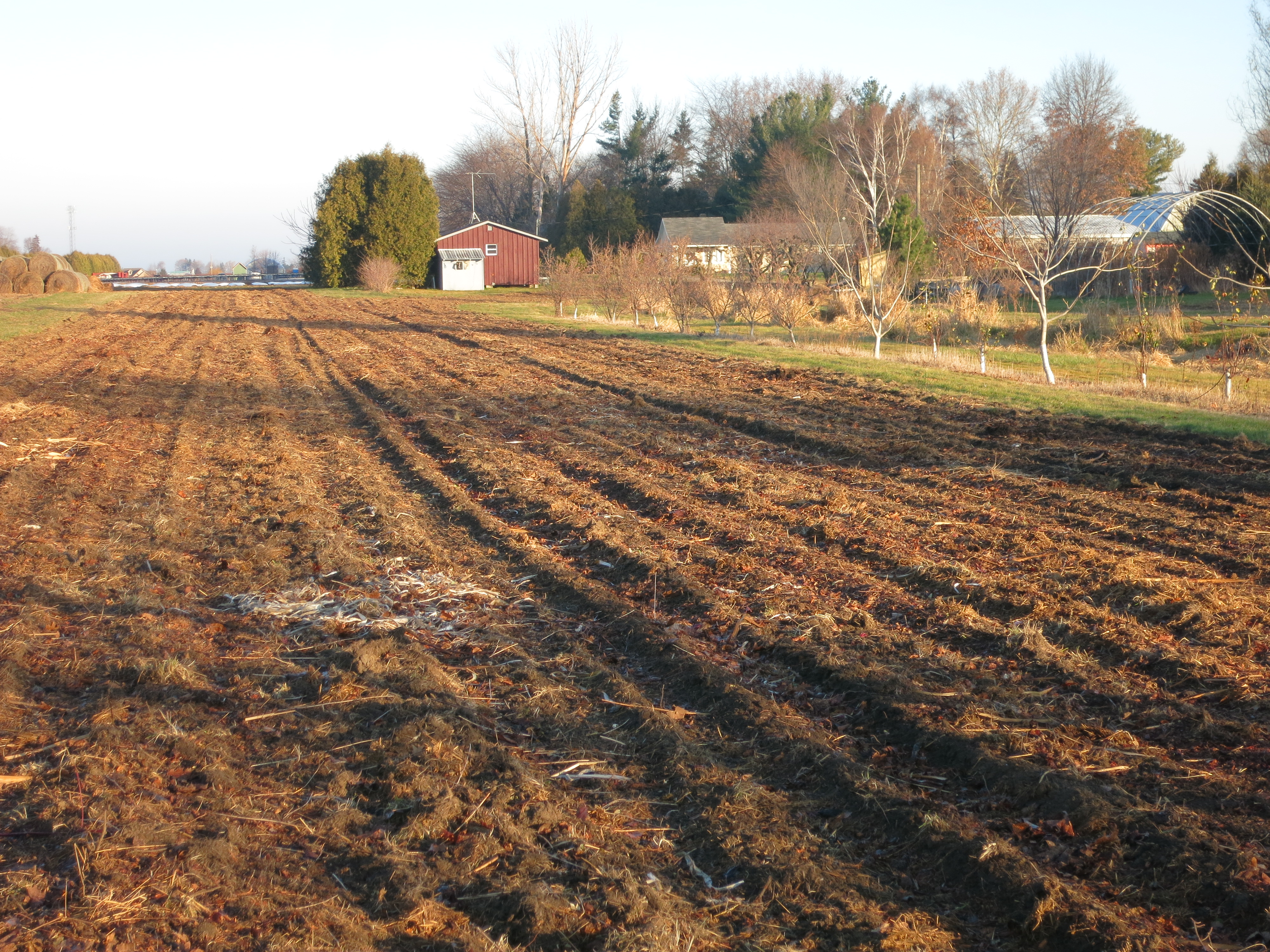 We really don’t like leaving the soil exposed over the winter – the winter winds cause erosion & blow our soil to the neighbours. However by the time we were finished everything, it was too late to seed a cover crop to protect the soil through the winter.