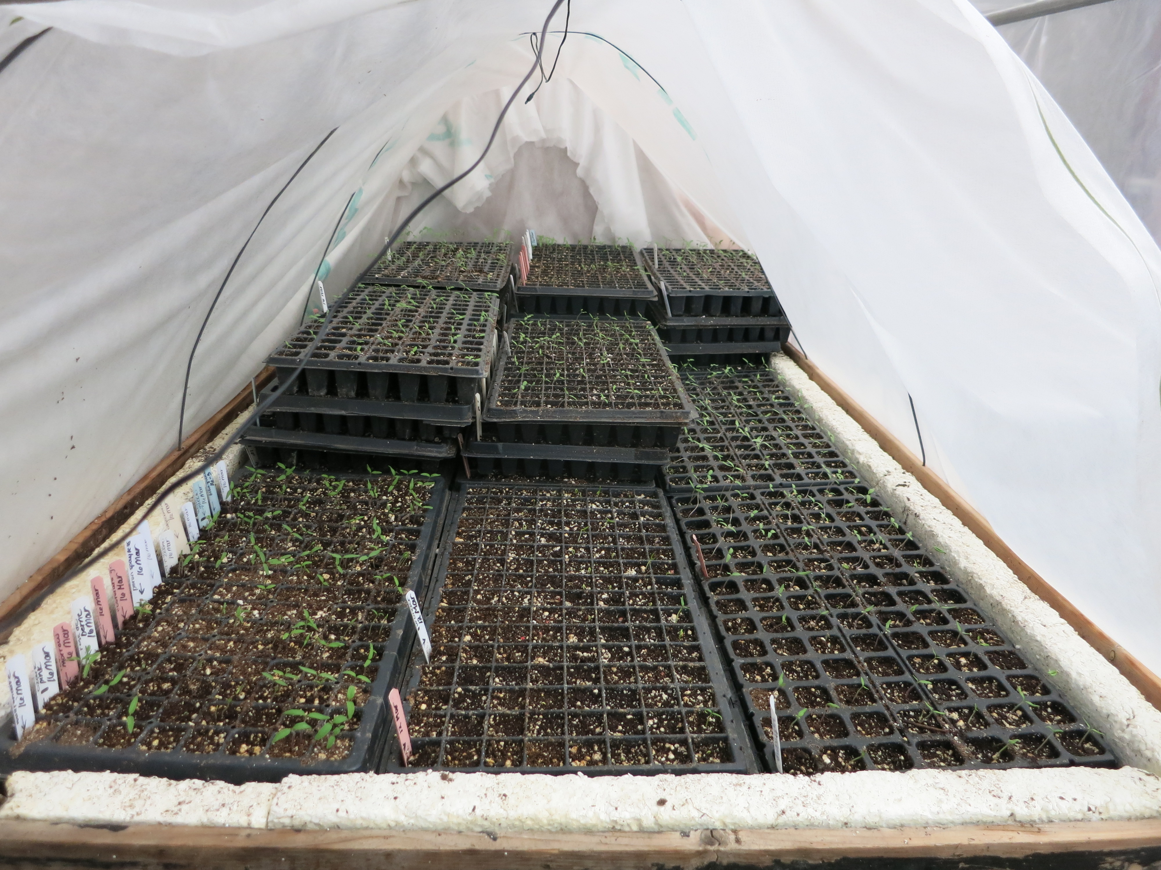 It’s a simple, primitive, low-tech set-up, but it works for us. Because we rely mostly on the sun we have less control over the temperature, and the plants experience a wide variation. Perhaps they grow slower & take longer, but I think they end up sturdier & hardier.
