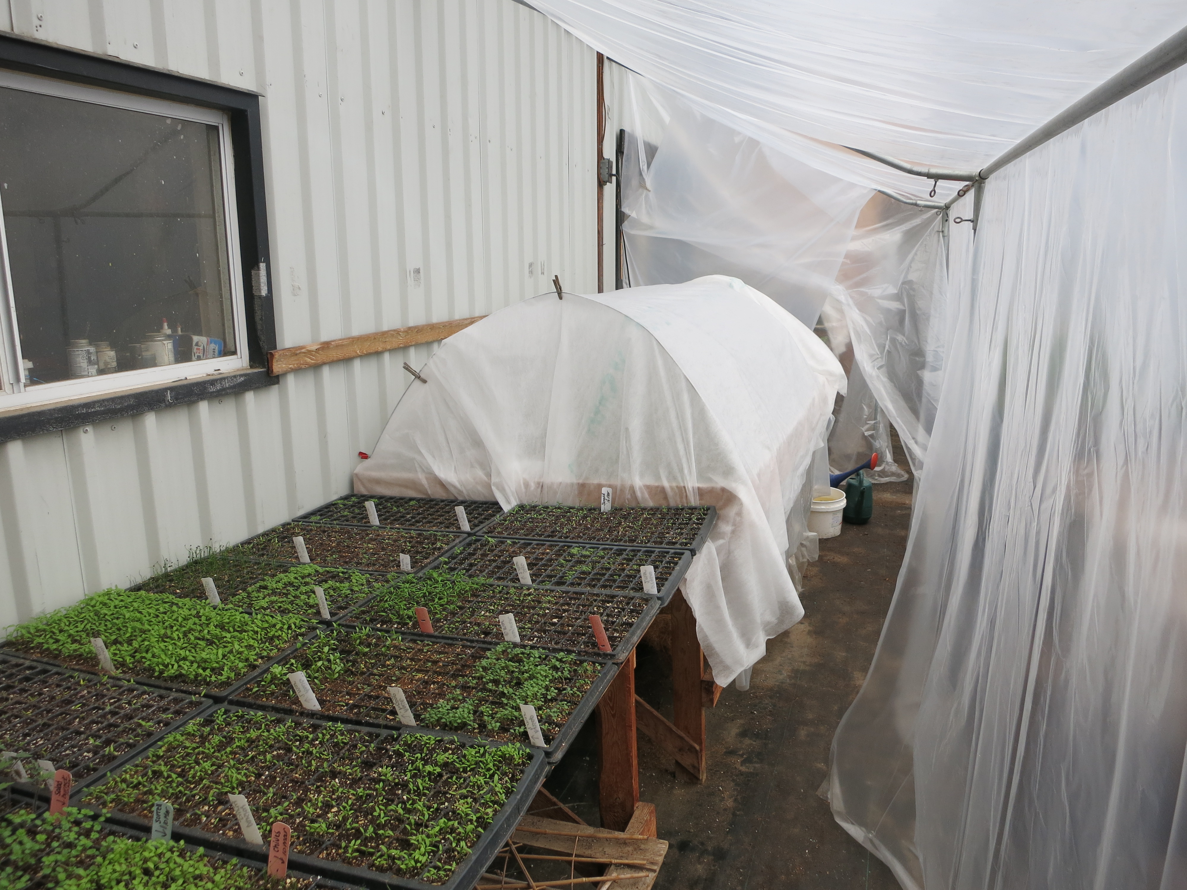 Over the germination bed there are wire hoops holding up a layer of row cover which keeps the heat in. This in turn is covered with plastic. It really is a greenhouse within a greenhouse within a greenhouse …