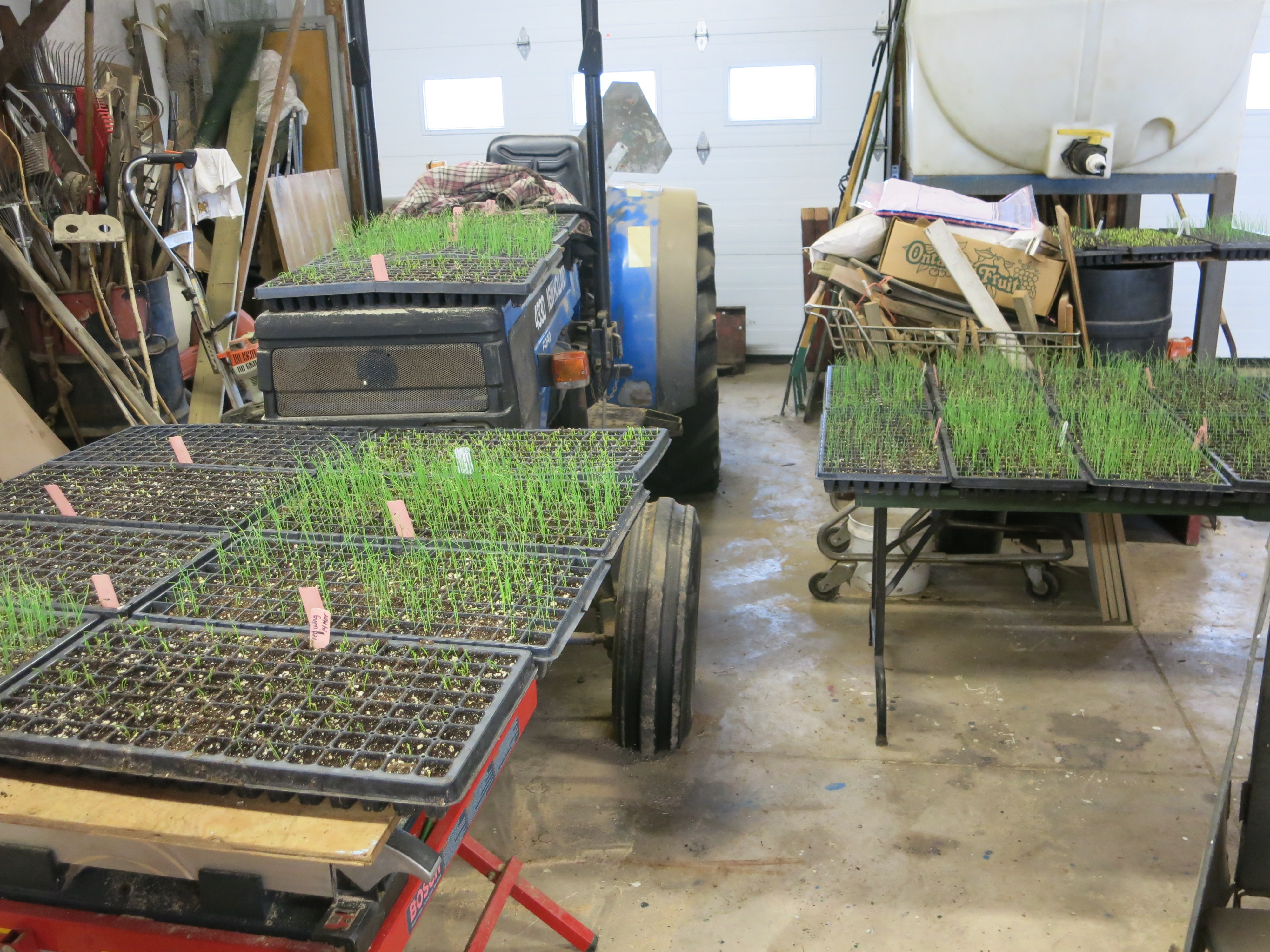 The germination bed has heating cables running through a layer of sand and surrounded by styrofoam. For seeds to sprout & grow, the temperature of the soil is important – more important than the air temperature. These heating cables warm the sand which warms the trays, and the seeds germinate usually in a few days. Light is not as important at this stage, so the trays are stacked up on each other until the seedlings start to poke through the soil.