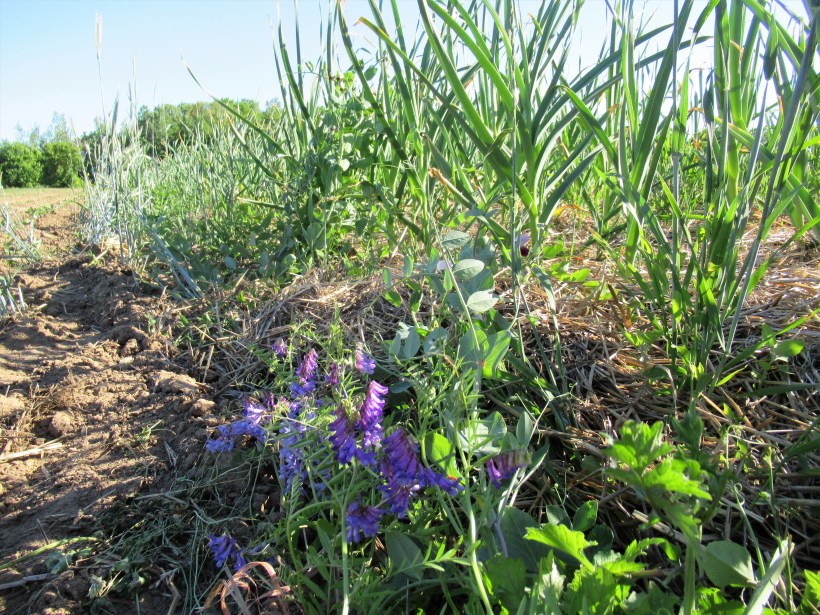 These purple blooms are hairy vetch that we had growing along with rye & other crops over the winter. Not all of it winter killed and now some is blooming beside the garlic patch. Vetch also fixes nitrogen in the soil, improves tilth & provides some weed control.