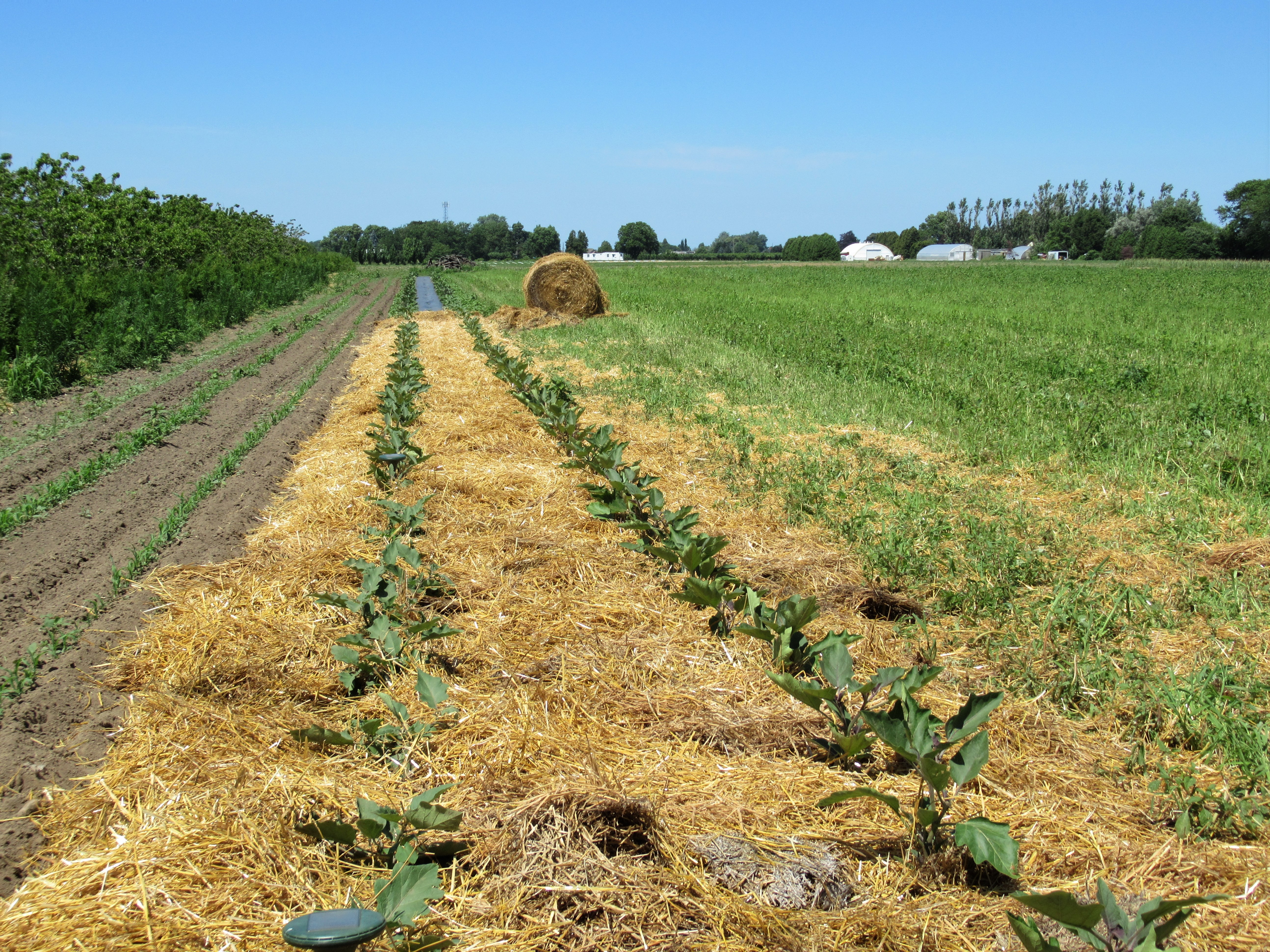 We don’t like to use a lot of plastic mulch on the farm. It’s difficult to lay done efficiently without the proper equipment, it requires irrigation and we don’t like the waste (it’s only good for 1 use). However we have used a plastic ground cover under our eggplant (just visible in the background). It’s a heavier woven material that can be reused for maybe 5 years? Because it’s woven, some of the rain can seep in and it’s relatively easy to install by hand. The holes for planting the eggplant are burned into the fabric. This material is under most of our eggplant and we used straw for the remainder. We’ll be able to compare and determine if there is a difference in how the plants grow & produce.