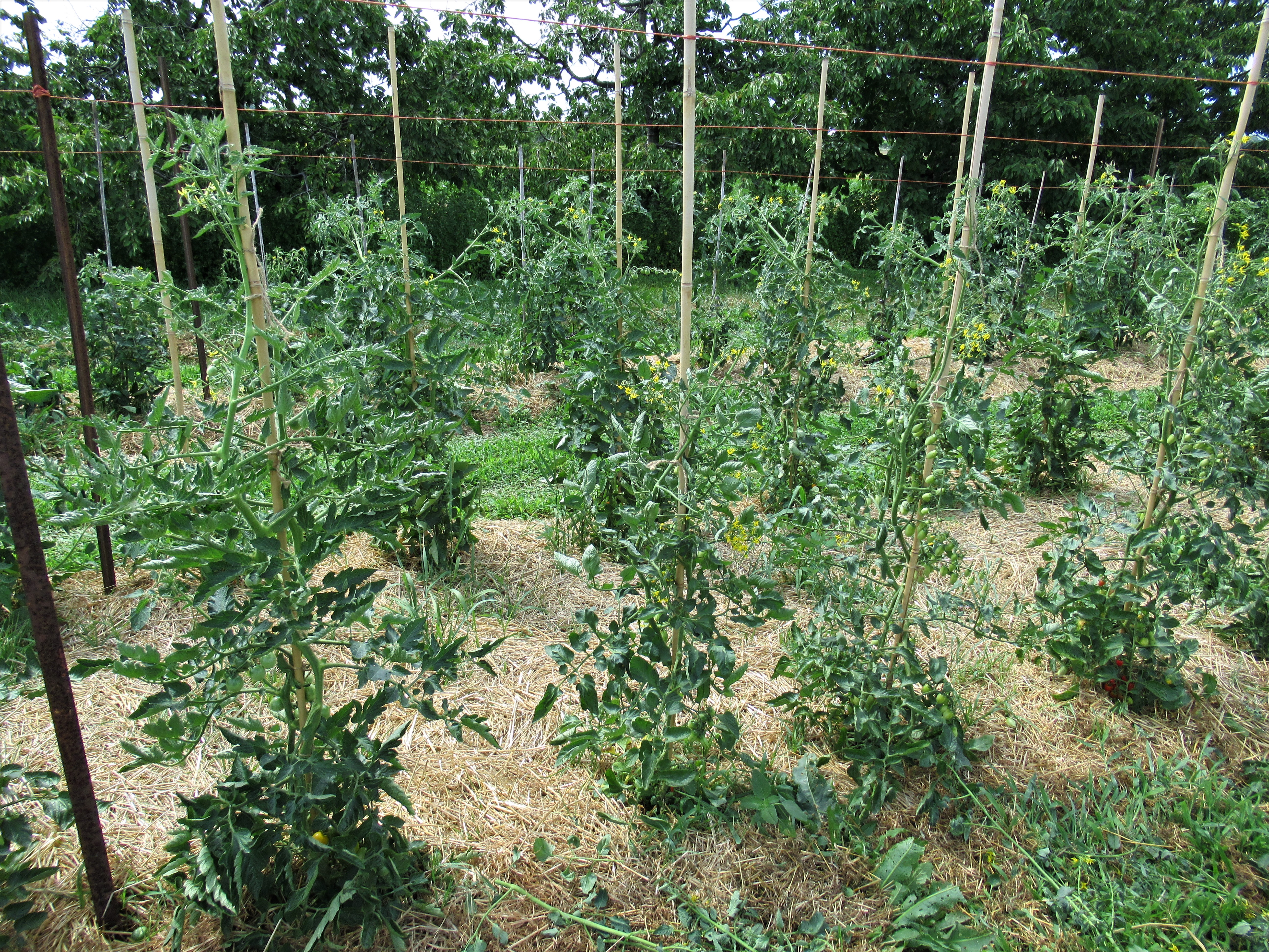 We feel suckering & tying the tomato plants gives us superior fruit & is worth the added work. And it is a lot of work! It has to be done again & again … every week is ideal. In a perfect world we would keep up, but all the other jobs on the farm still have to be done and so we fall behind. Then it is major surgery to remove the suckers & tie up the twisted, falling stems – challenging & slow work, but satisfying when completed. Of course letting the suckers get so big & then cutting them off is hard on the plant too.