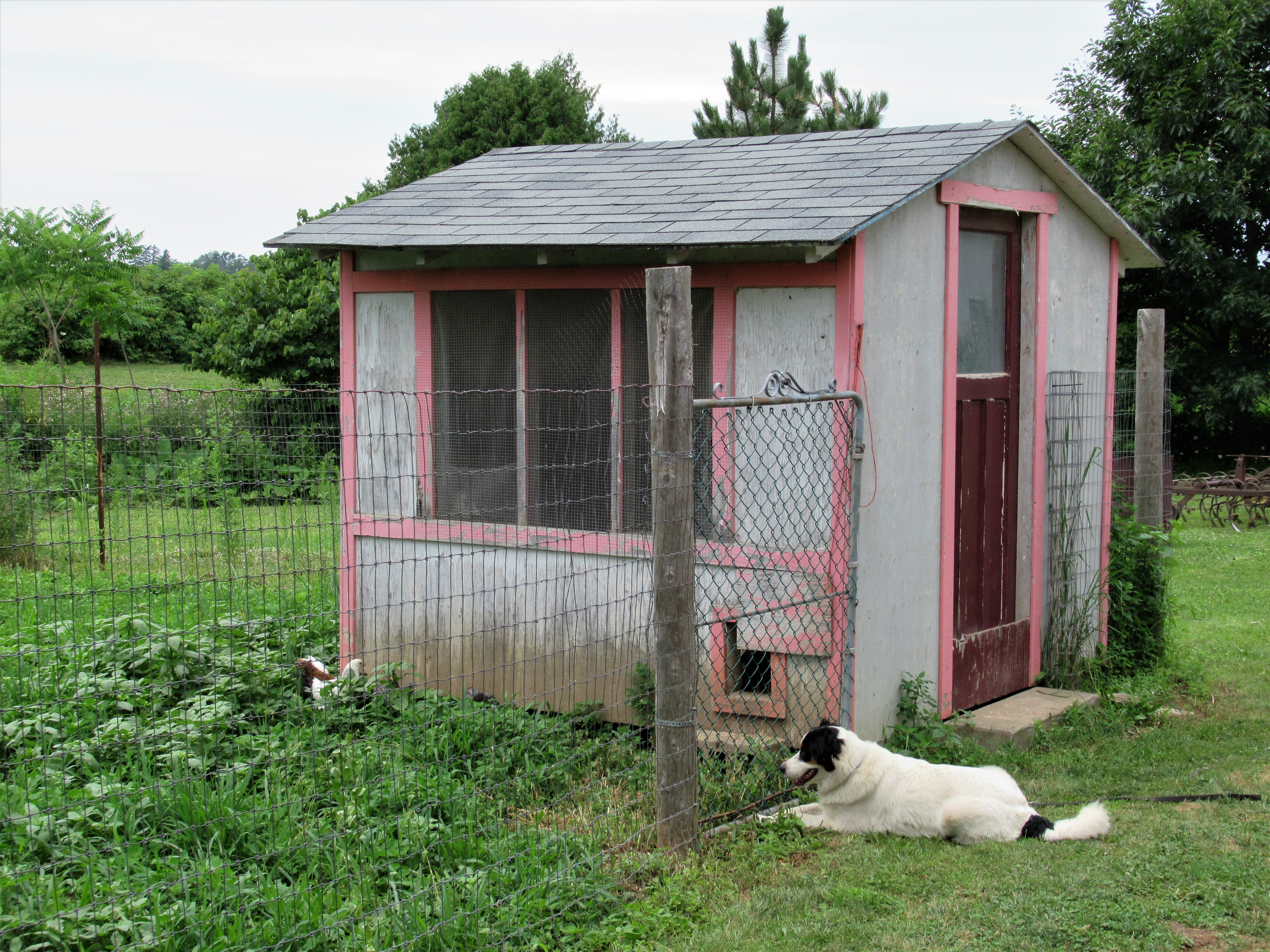 Those of you that visit the baby chicks when you pick up your share, will find them outside now – enjoying the grass & weeds and just being outdoors. Sage enjoys them too, spending a lot of her time “babysitting”.