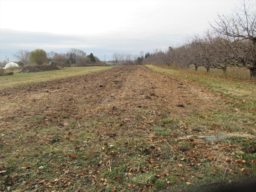 This was our tomato field this past season. It’s all cleaned up now, like the rest of the farm. I spread a layer of leaves and grass over it. These will break down over the winter & in the spring we will work them into the soil, then spread another layer of compost and this area will be ready to plant to vegetables again. The grass & leaves come from a lawn care company that dumps them in a pile on our farm throughout the season. I try to turn the pile over a few times during the summer. By fall much of it has decomposed and gets spread over the fields, adding beneficial organic matter & nutrients to our soil. Another pile of compost (to the left in the background of the picture) was made this spring with fresh manure, straw & leaves. It also got turned over several times this summer and is now beautiful compost that will be spread on the fields next spring.