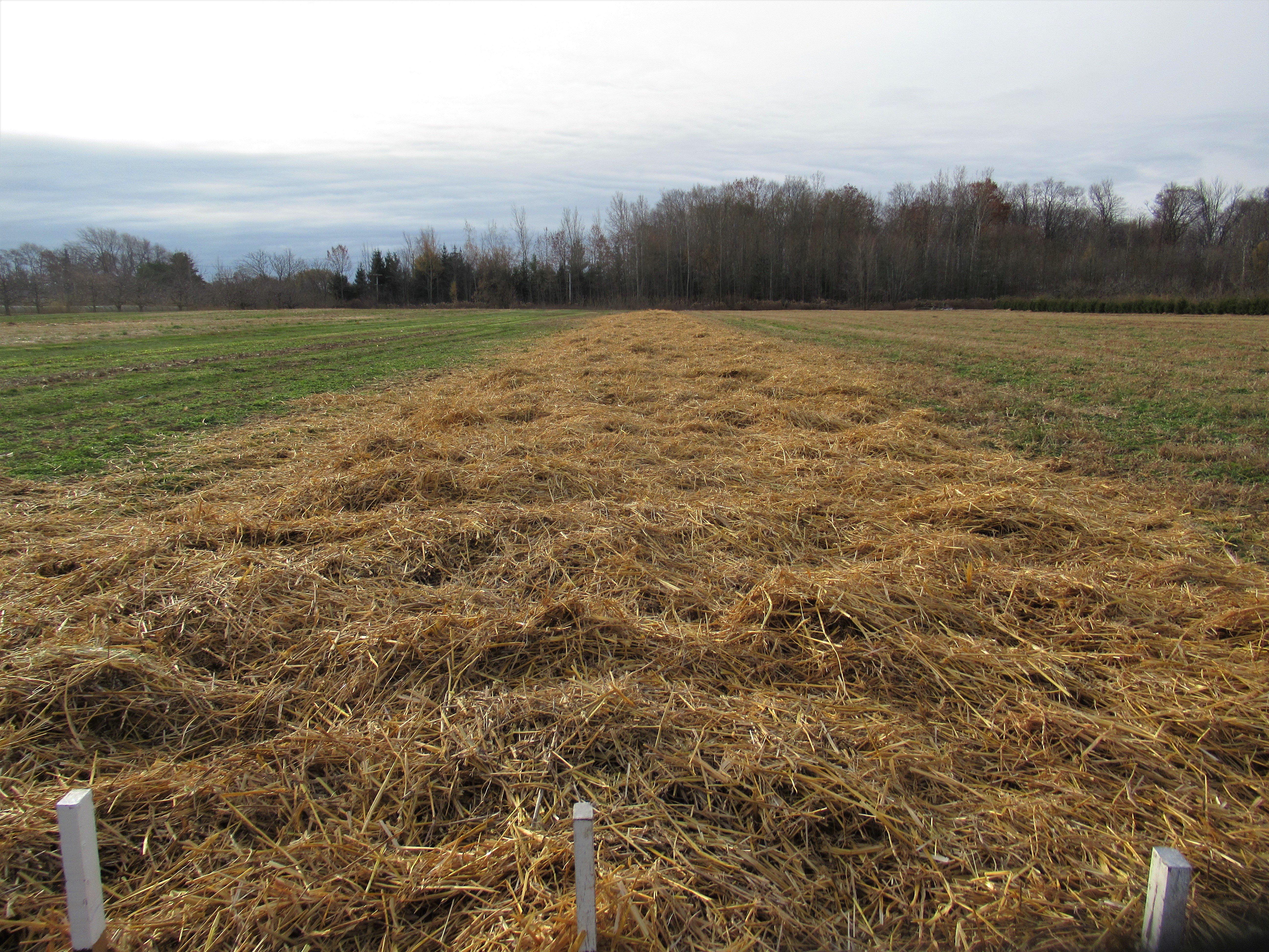 We mulched the garlic patch the other day. We prefer to do this when the ground is frozen, and before we get snow. A nice thick layer of straw protects the garlic from heaving – the freezing & thawing cycles of our winters can push the garlic right out of the ground. Straw will help maintain a more constant temperature. Having the ground frozen helps to discourage the mice from burrowing into the ground under the nice warm straw. The downside is that the garlic will be slow to start growing next spring as the mulch will prevent the cold soil from thawing & warming up quickly. Lastly, the straw will keep the weeds from growing next season, making the garlic patch almost care-free until harvest in July.