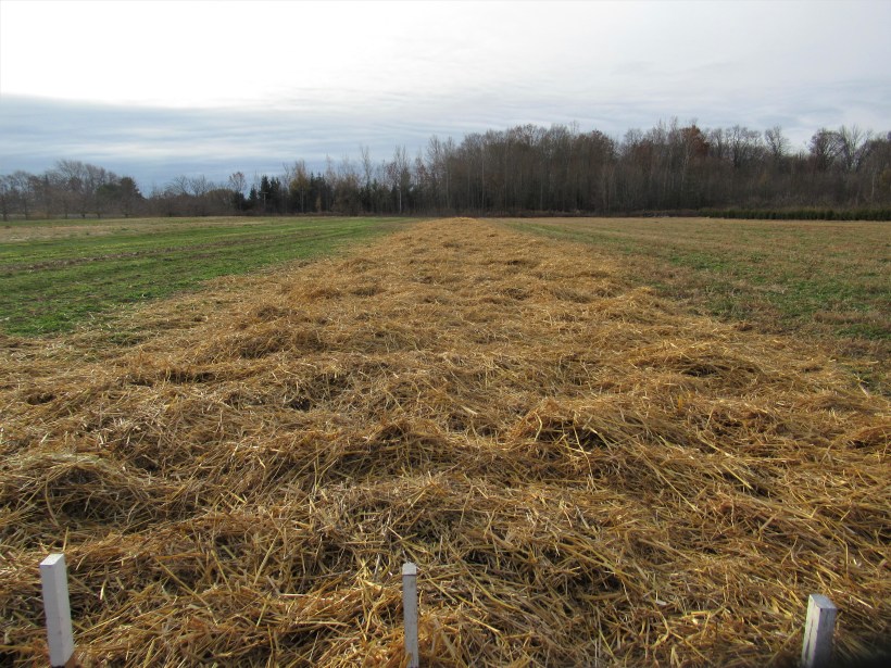 I had just starting spreading the straw when the neighbour came by. He was also spreading straw – mulching his strawberry fields – and generously offered to do my garlic. What would have taken me about half a day with the pitchfork, took about 10 minutes with his tractor & bale shredder. Thank you to a helpful neighbour!