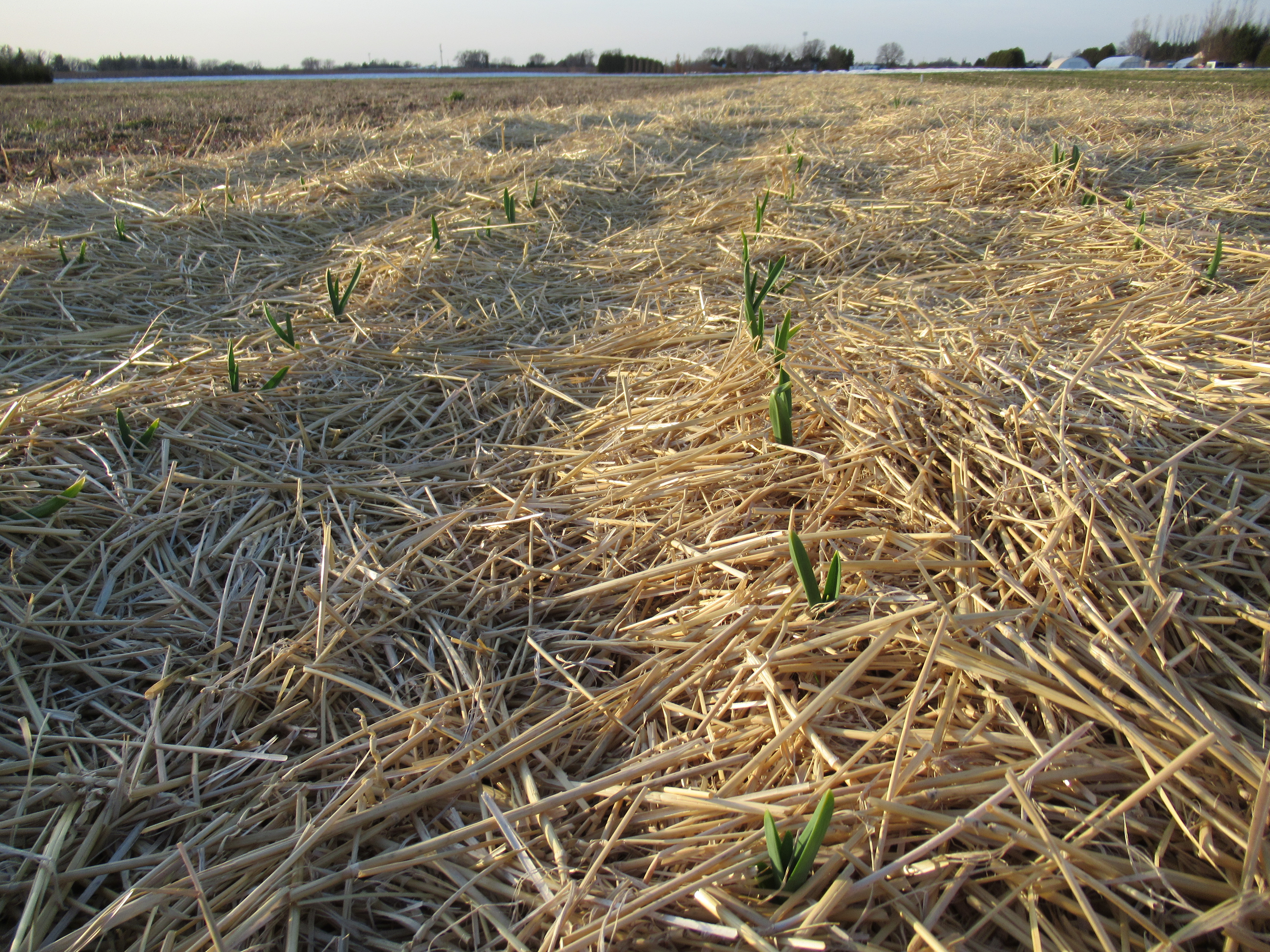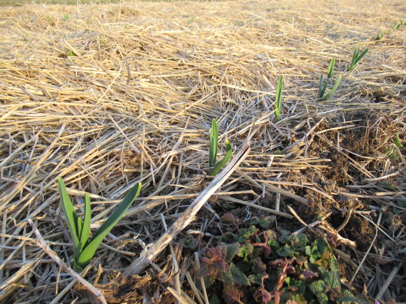 Our garlic is always slow to appear because of the thick layer of straw on top which doesn’t allow the soil to warm up early. This straw will is to keep the weeds from taking over and makes garlic a work-free crop until harvest in July.