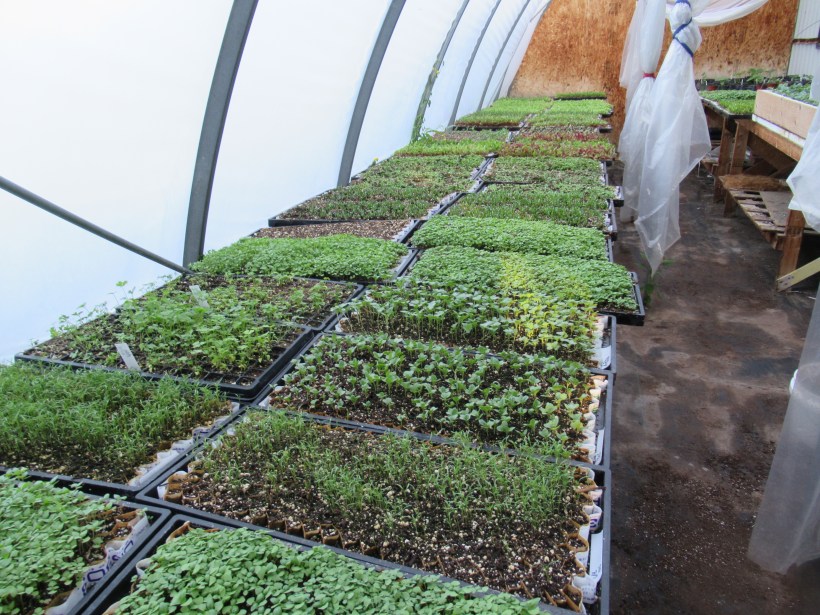 Every Monday Amy seeds trays of lettuce, spinach, etc … She seeded the first spinach back in early April and lettuce soon after. Then she added bok choy & green onions. Kale & swiss chard followed. Lately she’s added a salad mix, dill, cilantro & basil to the list. Every few weeks she also seeds trays of beets, kohlrabi, fennel … We’ve stopped bok choy for a while – it really doesn’t do well in this heat (nor spinach – but we keep trying since it is so popular with our customers). Green onion seeding also finished a while back. If our timing works out, the green onion harvest should end when the big onions are ready to eat. All these trays of seedlings are started inside our small greenhouse or outside in the yard.