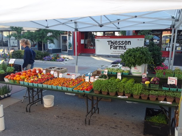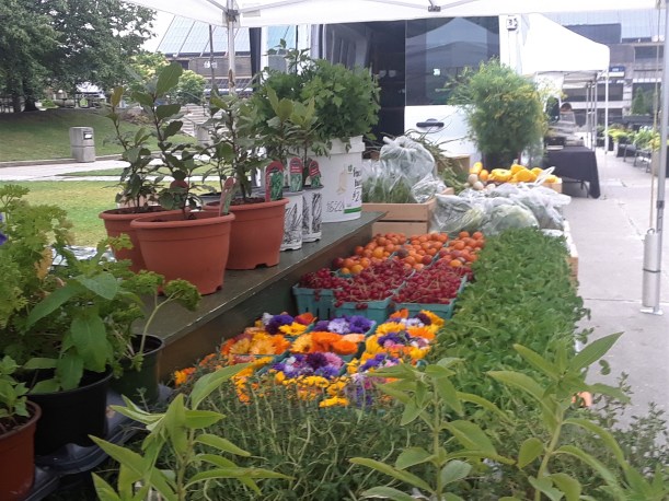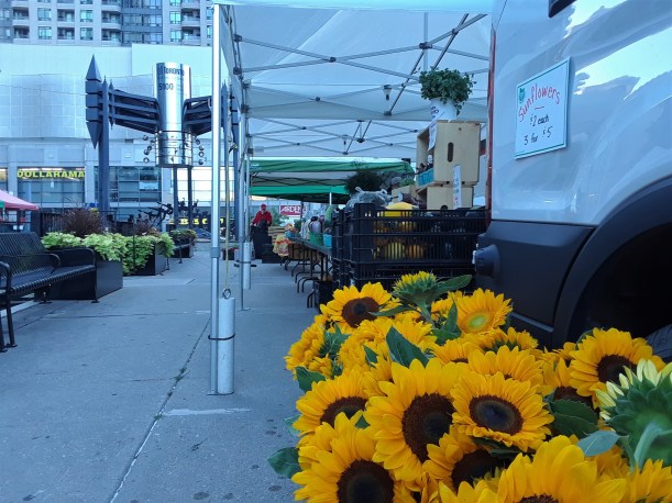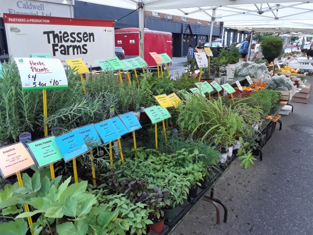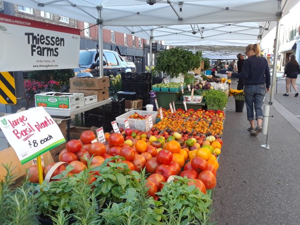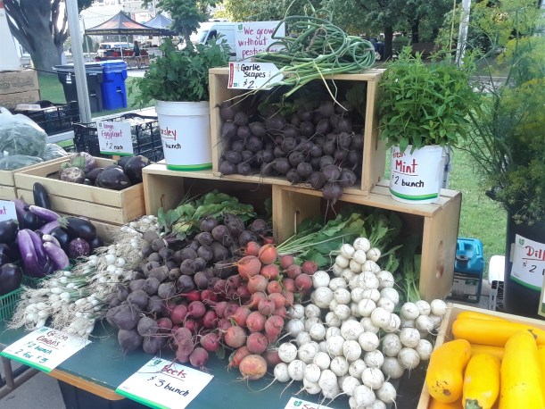 We have been selling our produce at various farmers’ markets now for more than 25 years. These last few years we attend 2 markets only – North York on Thursdays and Downtown Georgetown on Saturday mornings. It’s a privilege to deal directly with the persons who will eat the fruit of our labour – to talk and get to know them, and hear their comments & opinions about our vegetables. It’s also a lot of work – from picking & packing the day before, to early rising & loading the day of, and then driving to the market and setting up our stall.