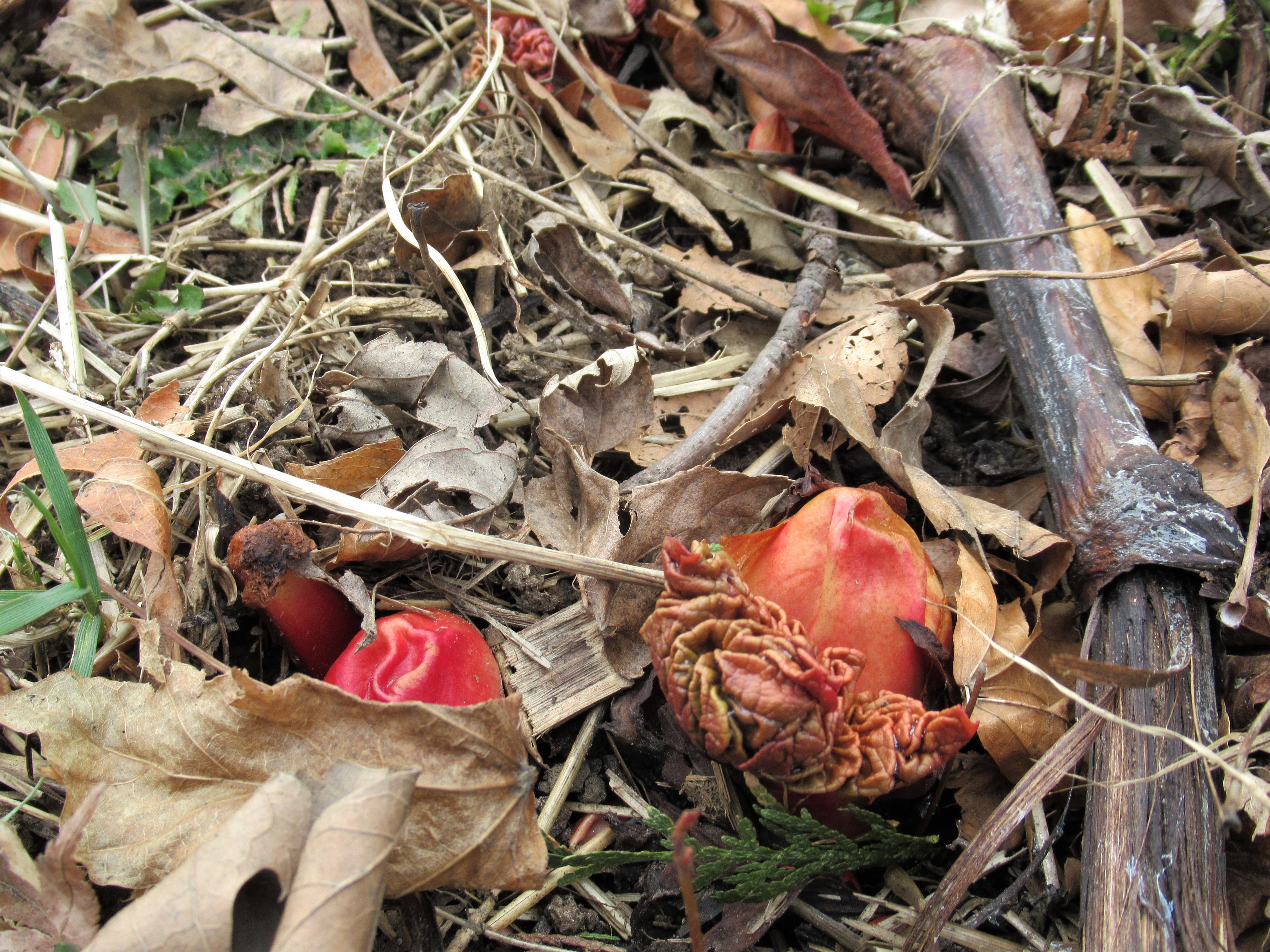 Tiny winter aconites were found blooming in the leaves & mulch underneath the redbud tree, right close to the road. I was checking the progress of the tulips & daffodils, and there they were – so small, yet so yellow and bright and beautiful and cheerful.