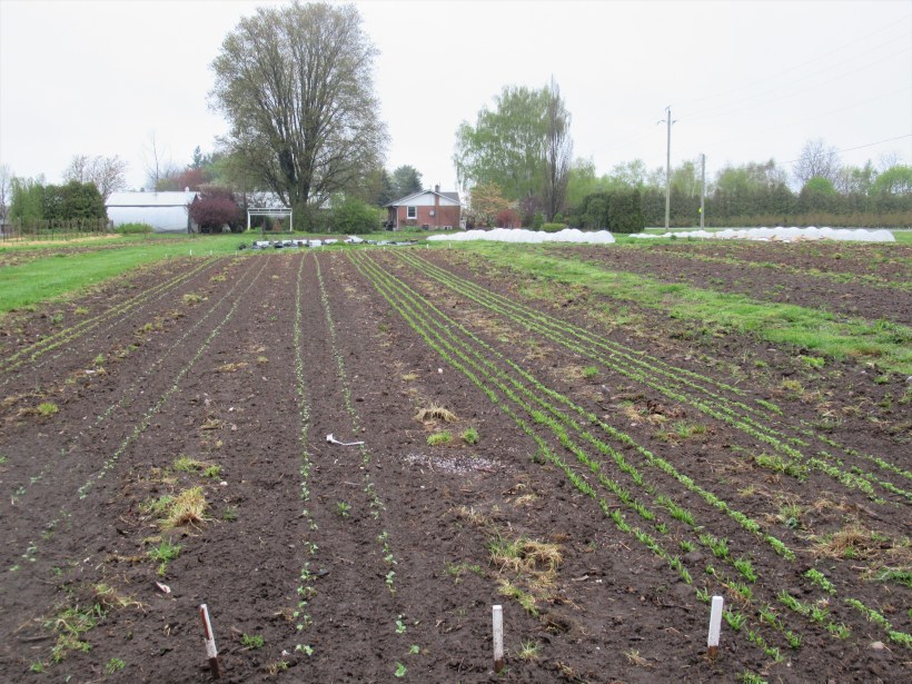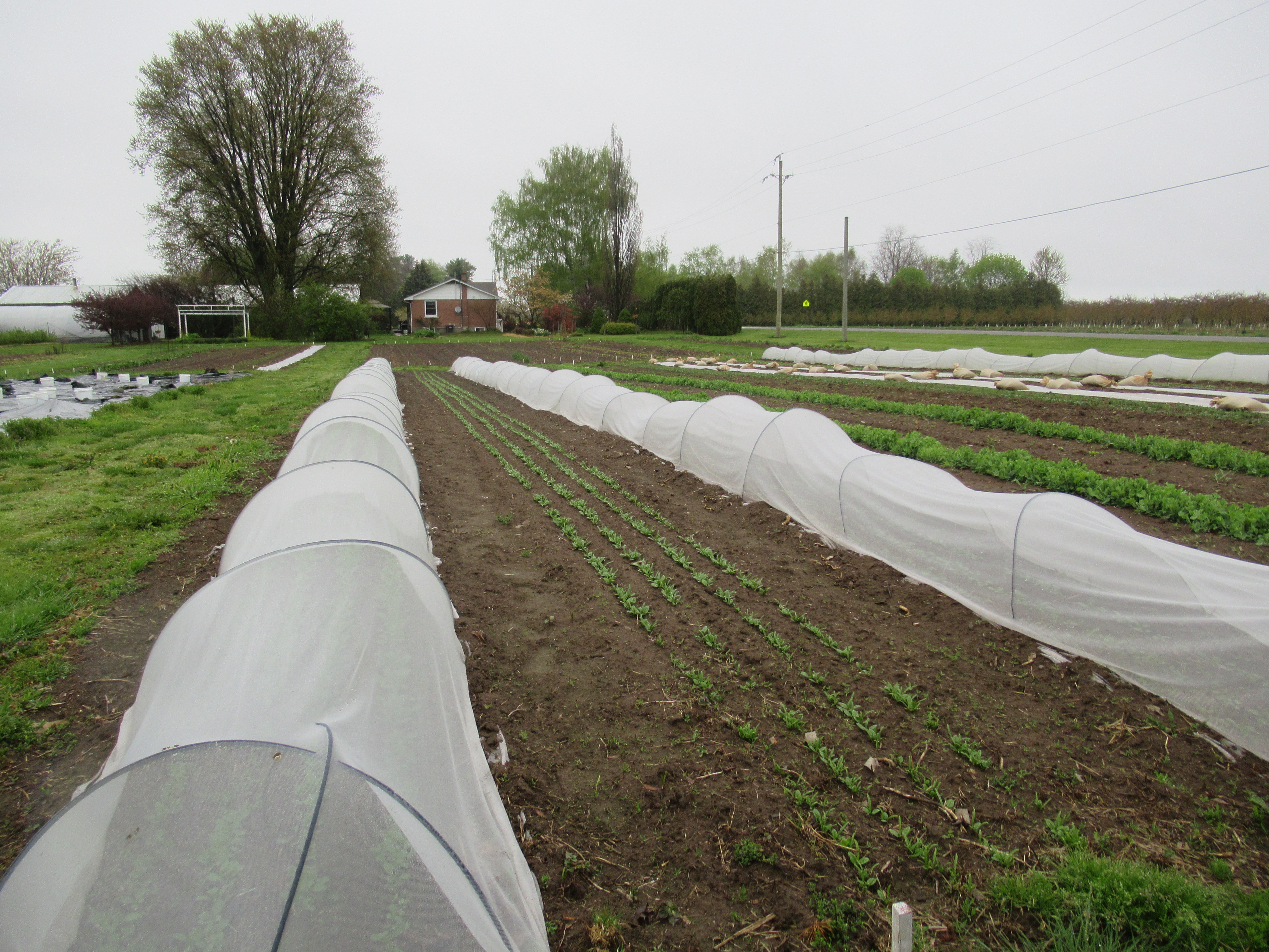 We were fortunate to suffer little damage. While there was no worry for the plants in the greenhouse, we covered everything with row cover anyway, for added insurance. Out in the field we knew most of the vegetables could handle temperatures around the freezing mark. We chose to cover the broccoli since it would take the longest to replace if we were to lose it. Spinach, lettuce, radishes … are all quick crops to grow and these we plant weekly, so we took our chances. In the end we only lost several rows of parsley and some lettuce both of which had been recently transplanted and were not well established yet. Everything else came through those frosty nights looking rather unhappy – but alive. They have mostly bounced back now!