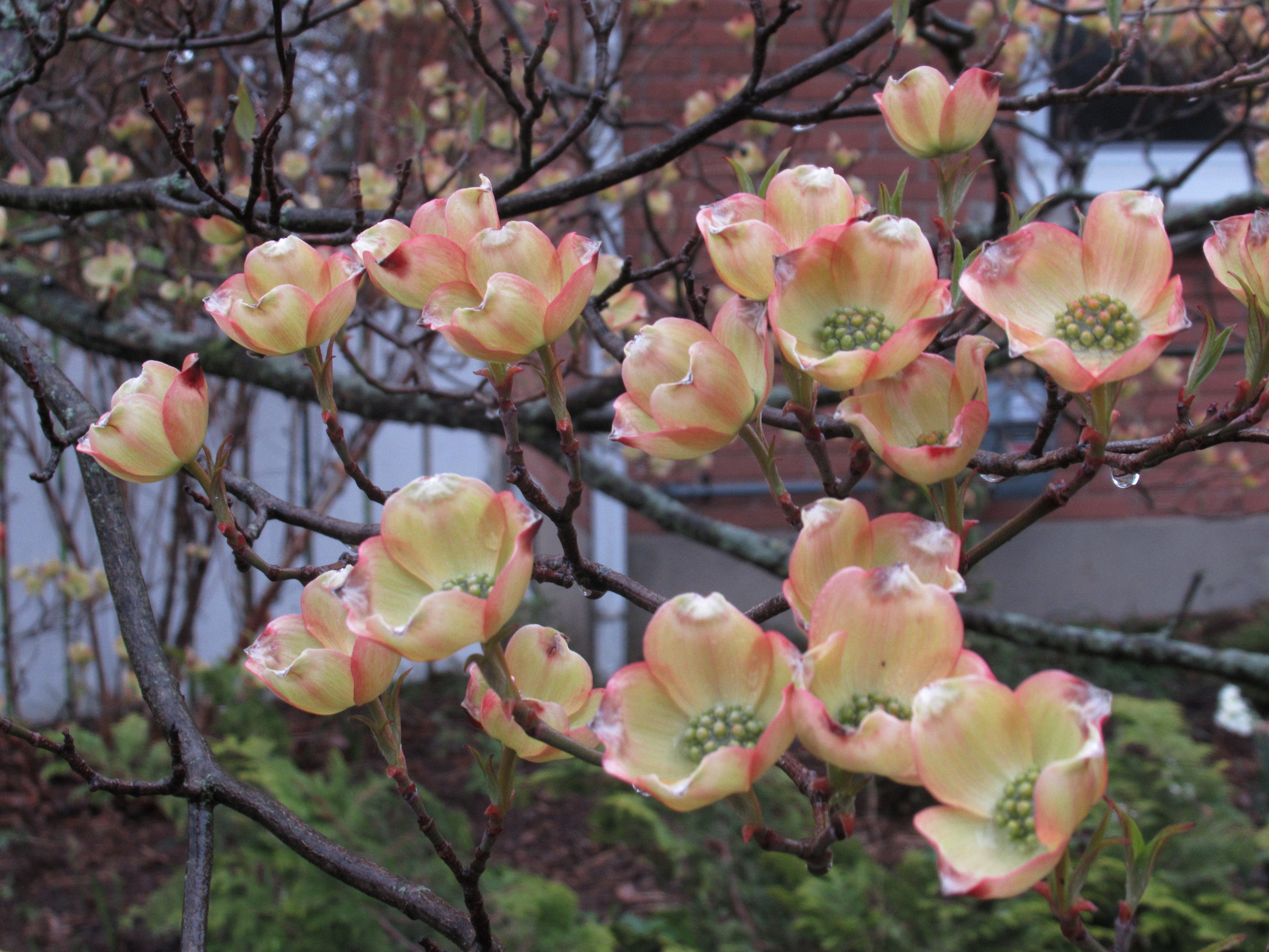 It’s a dogwood tree. They’re just starting to open – will turn white when fully open. Love the colour right now though.
