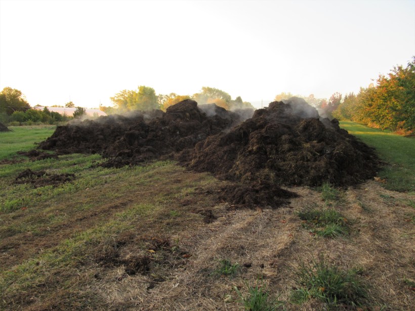 The other parts of our fertility program include straw mulch, wood chips, compost & cover cropping. Mulch prevents weeds from growing, keeps moisture in the soil and adds nutrients & organic matter as it decomposes. Wood chips can do the same thing. We make compost by mixing manure together with our vegetable waste, straw and any leaves, grass clippings etc. that a local lawn care company drops off at our farm.