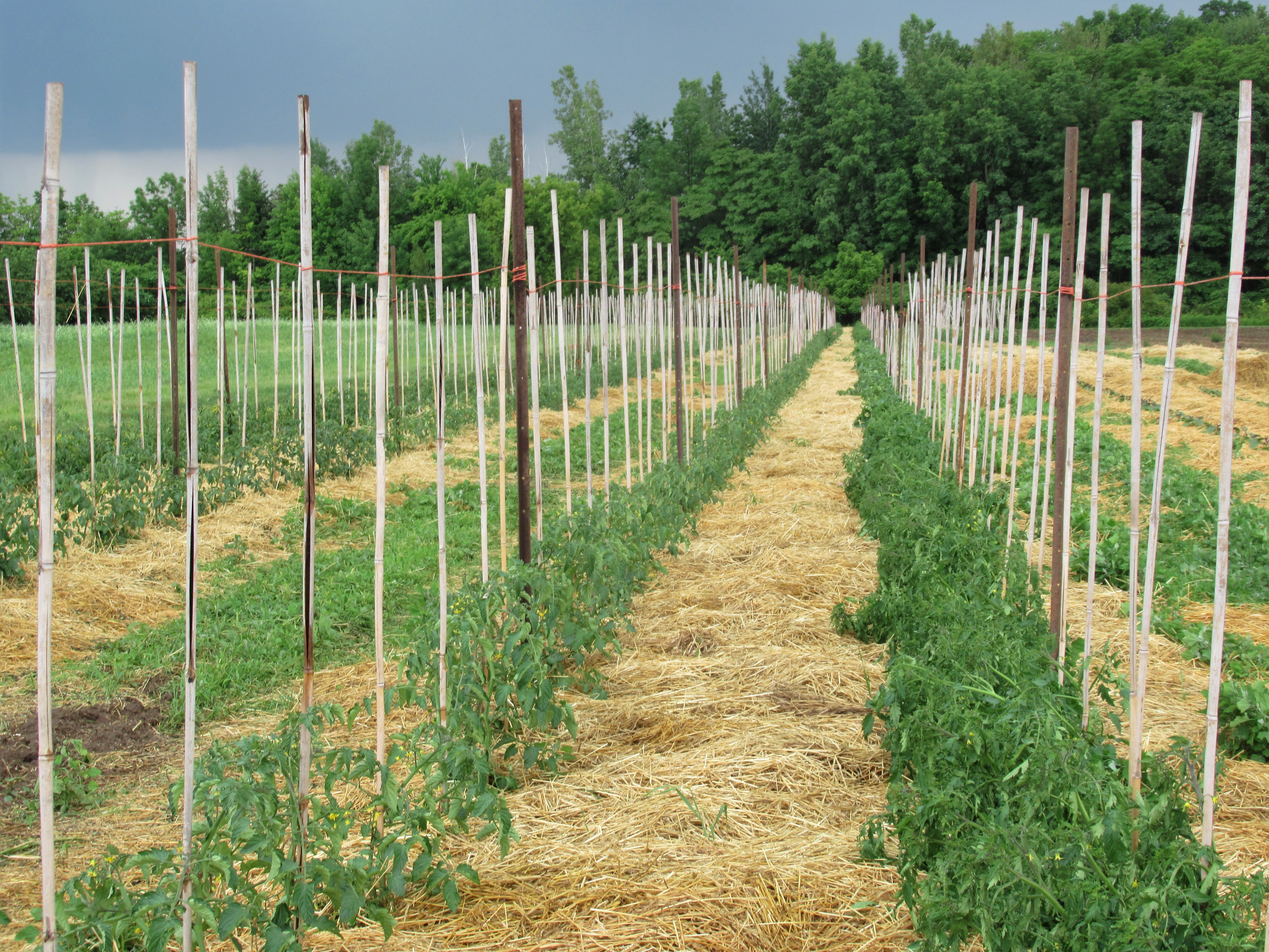 Tomatoes are staked and we’re pruning & tying now. The row on the left has been pruned & tied. The row on the right has not. We will continue to prune & tie regularly (or as time permits) until the plants reach the top of the stakes.