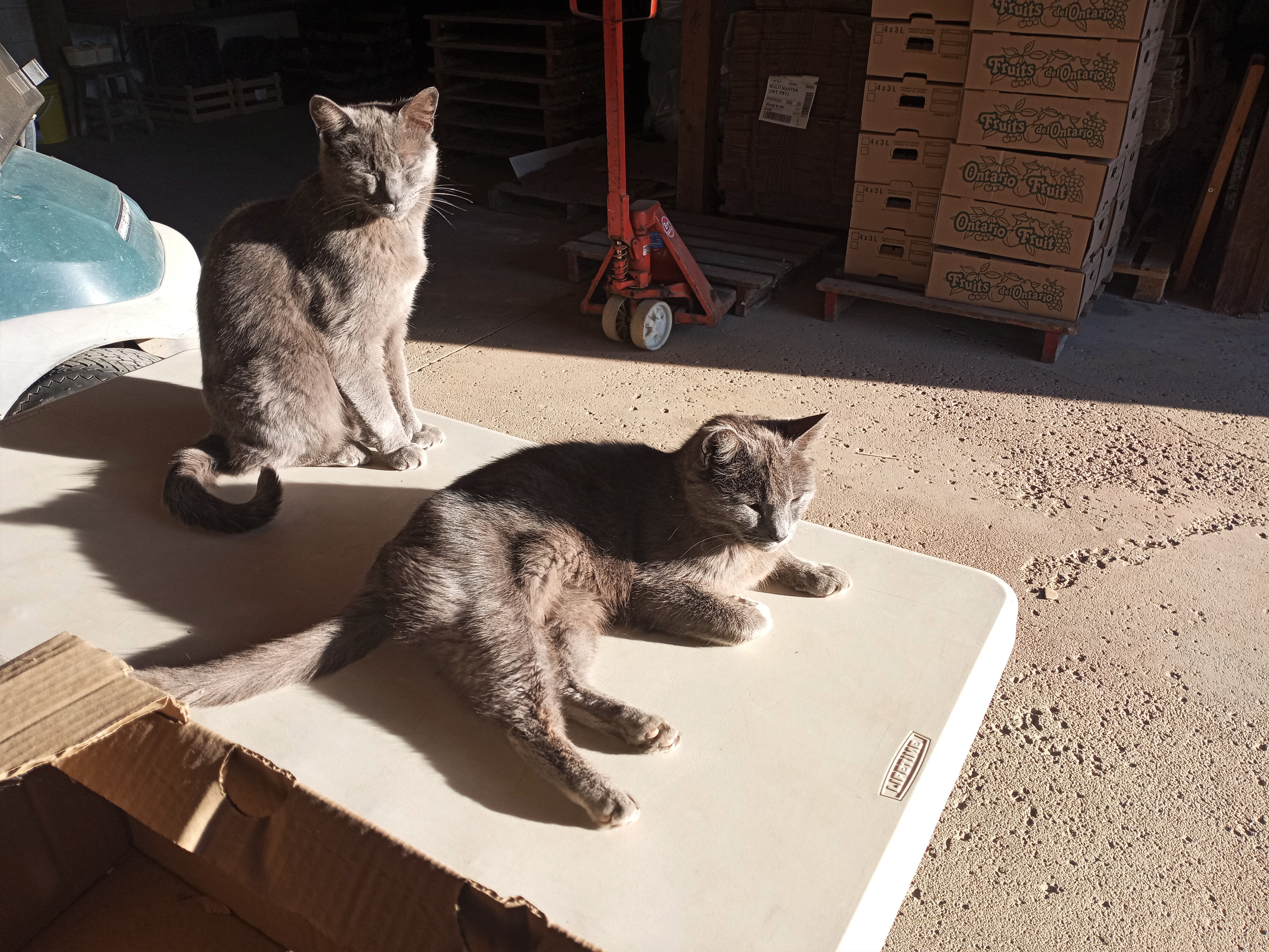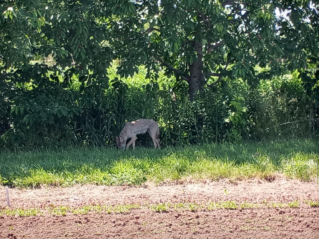 Our “friendly” coyote enjoying some lunch (probably a rabbit) and not at all worried about me on the tractor about 10m away. When I got off the tractor he ambled to the other side of the row of trees and watched me work. We see him around the farm several times each week.