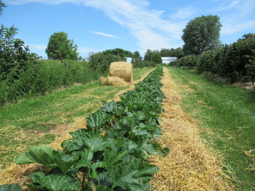 We continue to try and control the weeds where we can but we will also mow them on the paths between our vegetable beds. Mulching with straw is our main way of keeping down the weeds and still covering the soil – like this row of zucchini.