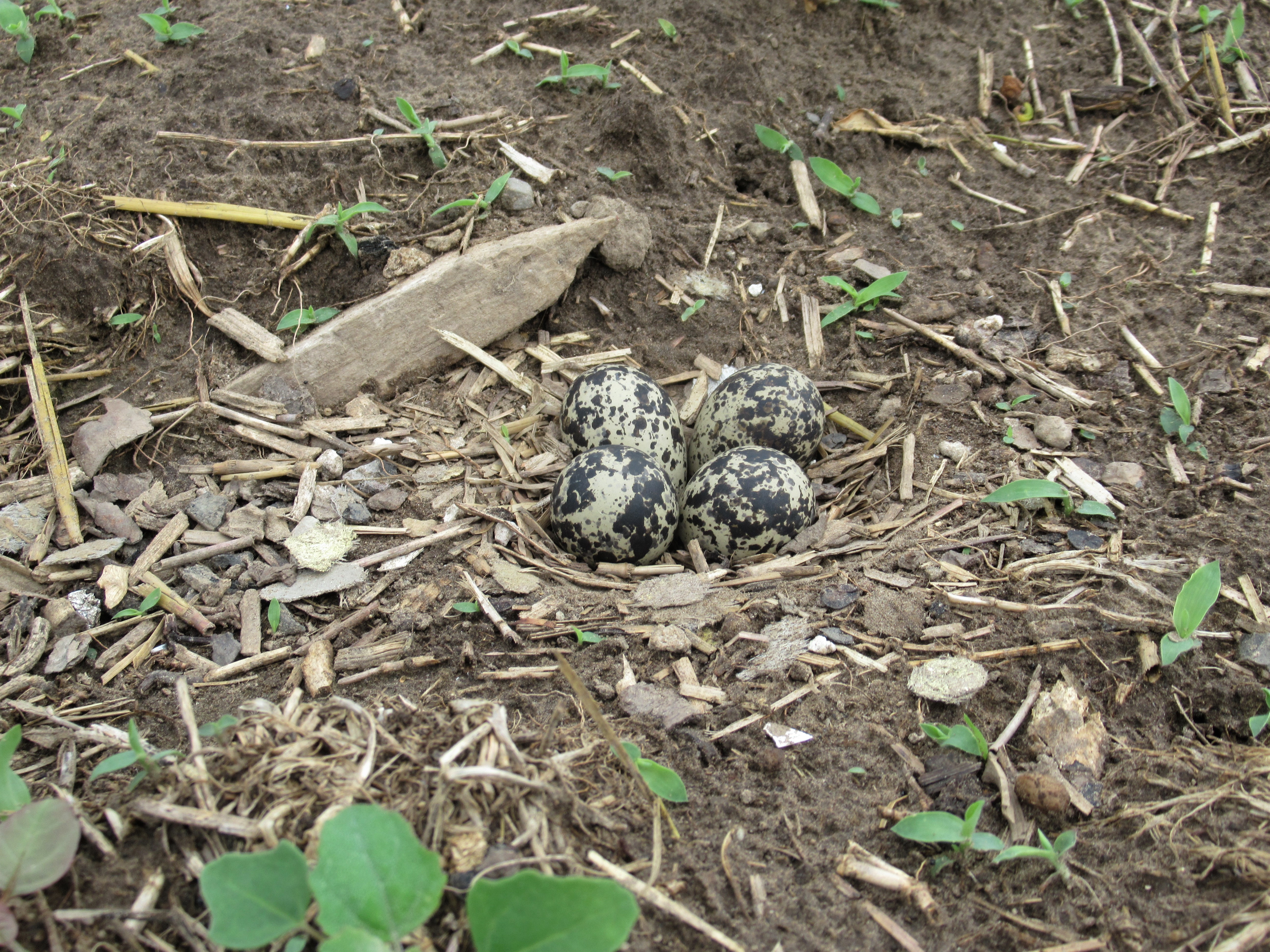 Killdeer nests – we have not 1, not 2, but 3 nests with eggs in our fields right now. While the nests themselves are difficult to spot, the killdeer parents make a hug fuss when we are in the vicinity. Their cry is shrill & piercing – not at all pleasant to be working nearby. When we find a nest we mark it with a bright flag so as to not accidently drive over it. The eggs hatch quite quickly and the birds are gone in a few weeks it seems.