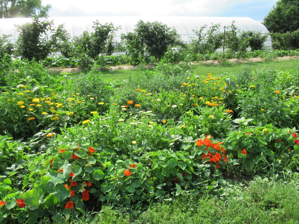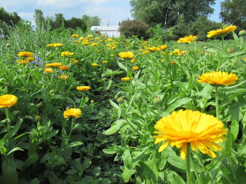 Our edible flower patch – a beautiful site even with all the weeds. Edible flowers are a good seller at market plus they make our display more attractive. These calendula will also go to a naturopath who will use them to make a healing salve.