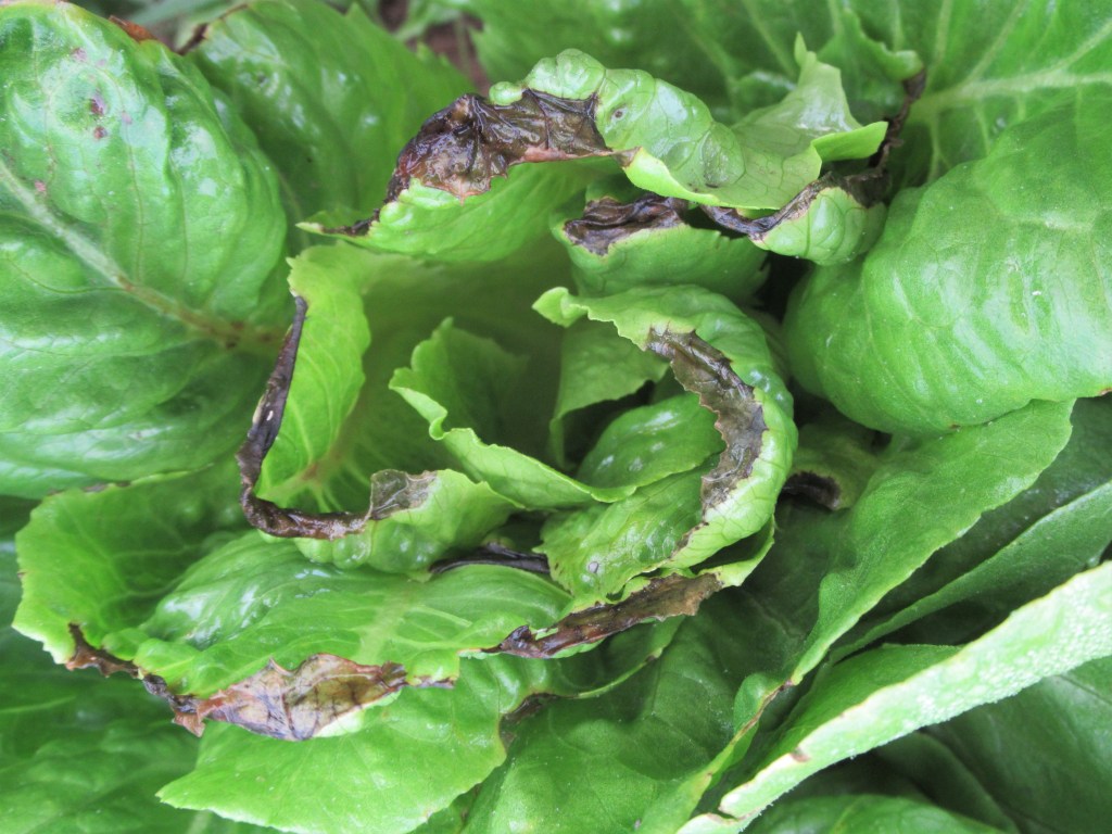 And this planting of green mini romaine got leaf tip burn from the heat – the edges of all the leaves turn black. Every single head is ruined! The red romaine was mostly ok.