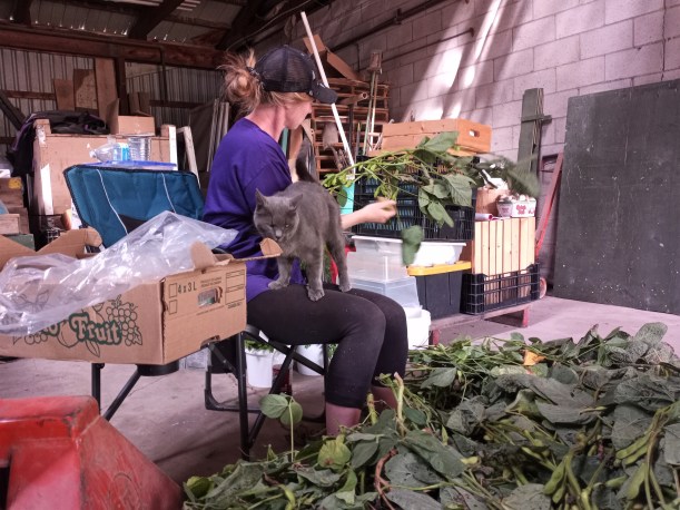 In Asia they are sold by the plant with the bean pods still attached. We tried that one of the first years we grew them – it didn’t go over very well at market. Now we harvest the entire plant, cutting it off at ground level. We bring them into the barn where we can sit in comfort and pull the pods off the plant. It’s a cushy job – especially on a hot afternoon!