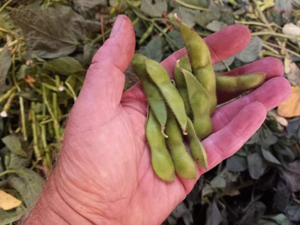 Edamame – or fresh green soybeans – are a vegetable we always look forward to. But they take a long time! We seeded them in trays in the greenhouse in early May, transplanted them to the field a few weeks later, then waited until now to harvest them. That’s about 4 months! They should have been ripe & ready to pick a few weeks earlier but because it has been so dry they took their own sweet time to mature. The pods just hung there on the plants for the longest time without plumping up – we actually had about given up on them.