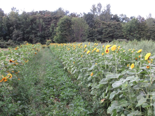 Everything was going smoothly with our sunflowers. A new planting was ready for harvest each week just as we planned. Then the heat of August hit and they matured faster & faster causing a sunflower overload. Then the birds dug up and ate the seeds of 2 plantings before they could even germinate! We stretched out some shiny, reflective ribbon for the last planting to try and keep the birds away- it worked! But we will have a sunflower gap at market for a few weeks towards the end of September before these are ready. Not everything goes according to plan!
