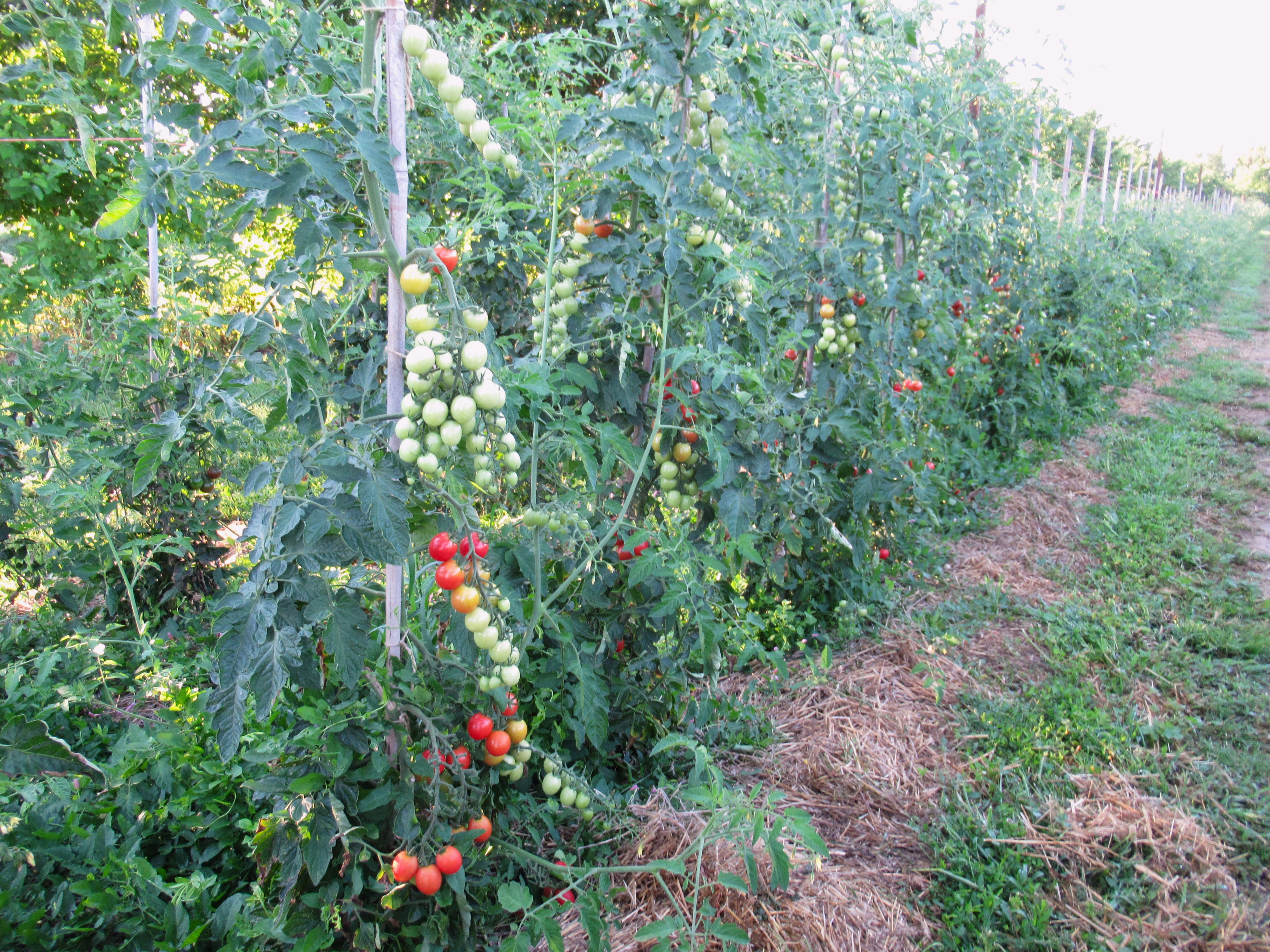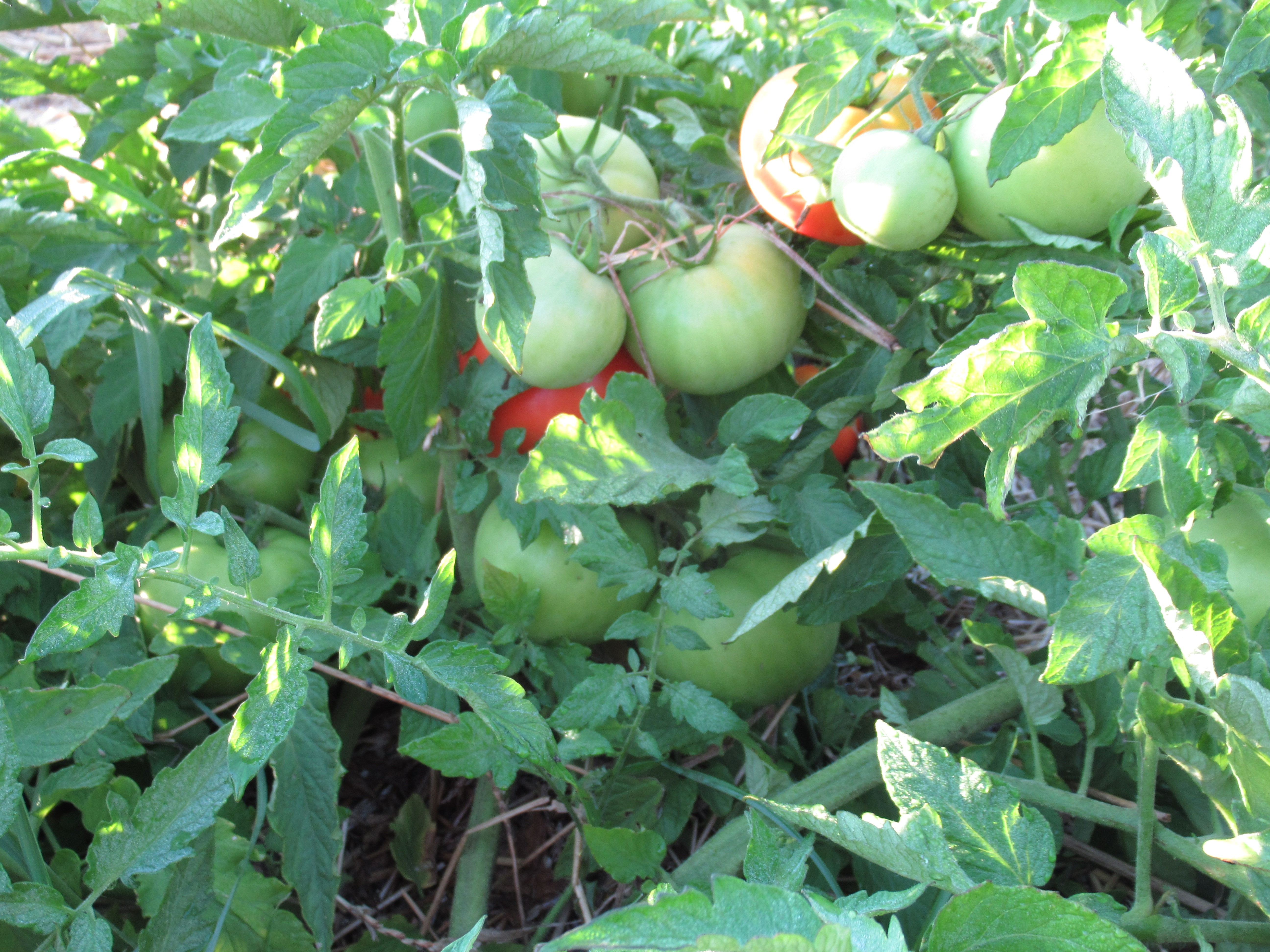 Onions, eggplant, mini romaine lettuce, bok choy, green beans, cherry tomatoes, beefsteak tomatoes, garlic.