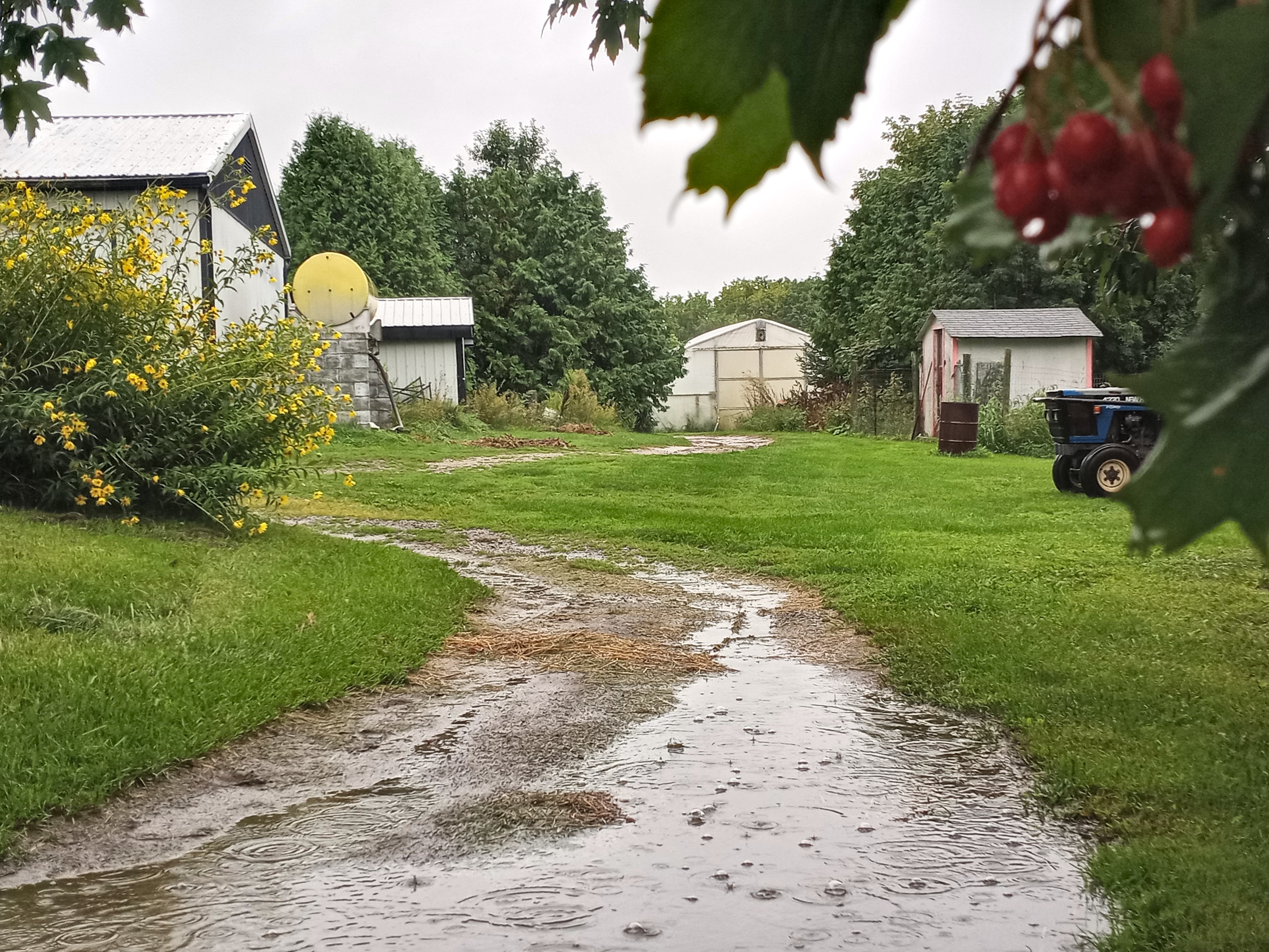 The downside of this rain is the damage it can cause to the vegetables – tomatoes tend to crack, peppers rot, greens too. The weeds will flourish. Our picking schedule is thrown off.