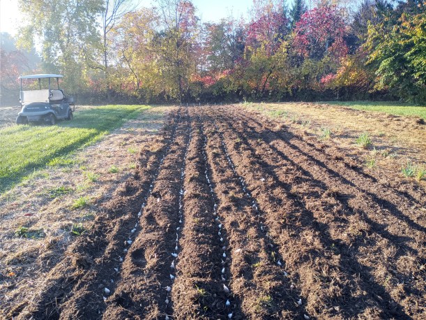 Today we planted garlic, the last crop to be planted this year. We put in 7 rows, each 250′ long. That’s approximately 4500-5000 cloves. Should be enough!