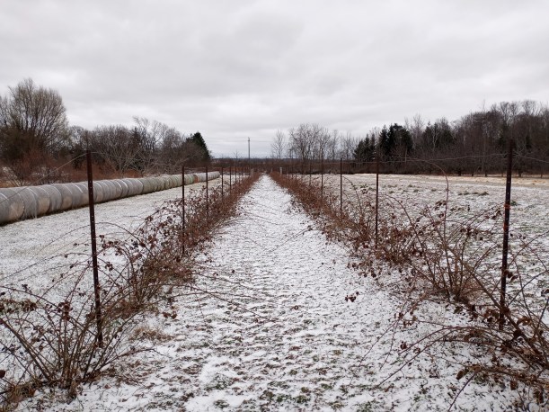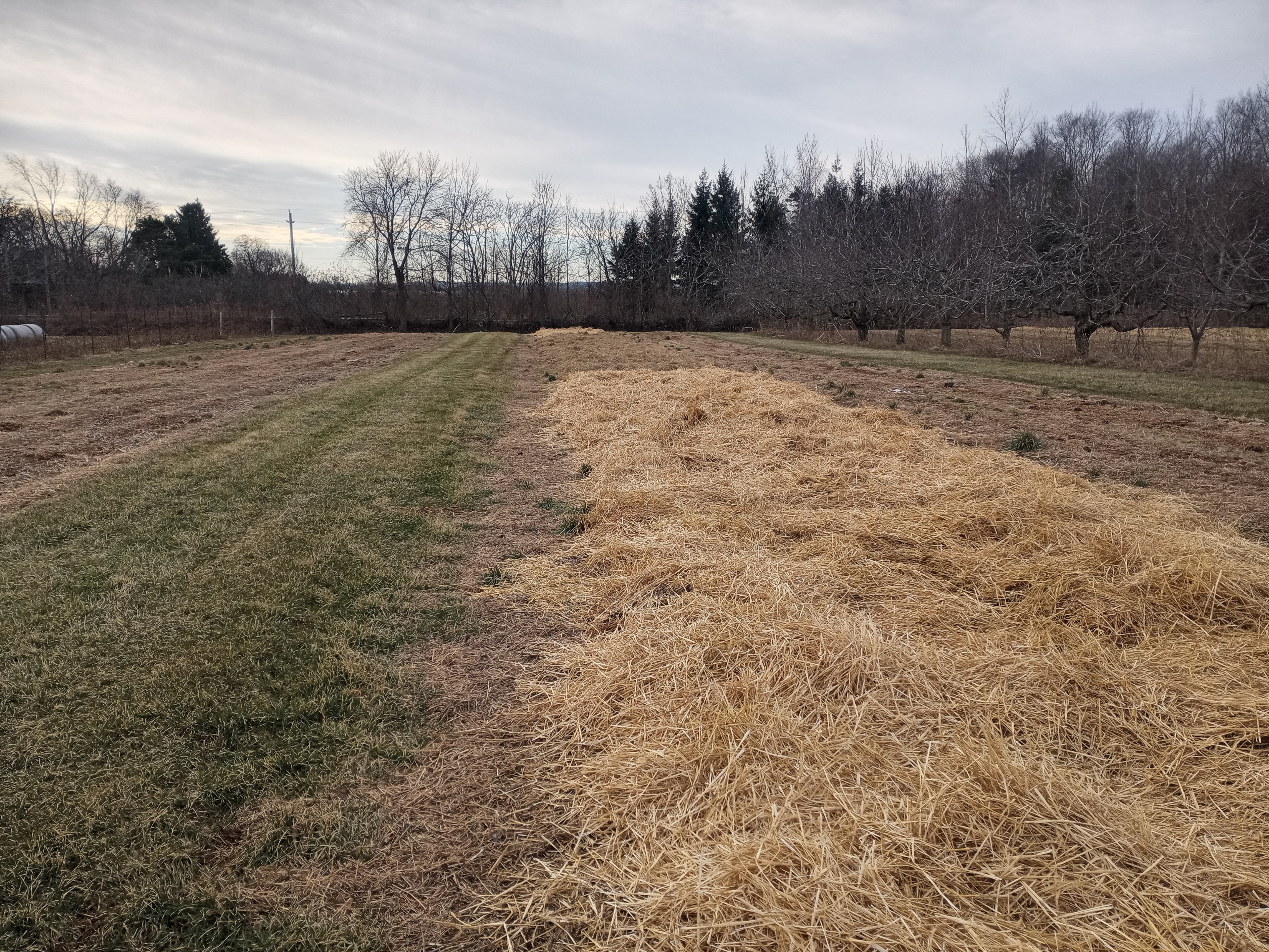 The garlic patch is finally mulched. The ground should be frozen with no snow – but that hasn’t happened all winter! We finally picked a coldish day when the ground was almost frozen. Mulching on soft, unfrozen soil encourages mice to settle in where its nice & warm. But some of the garlic was heaving – being pushed out of the ground by the freezing/thawing temperatures so it had to get done. The garlic will grow through the straw in spring, but most weeds will not.