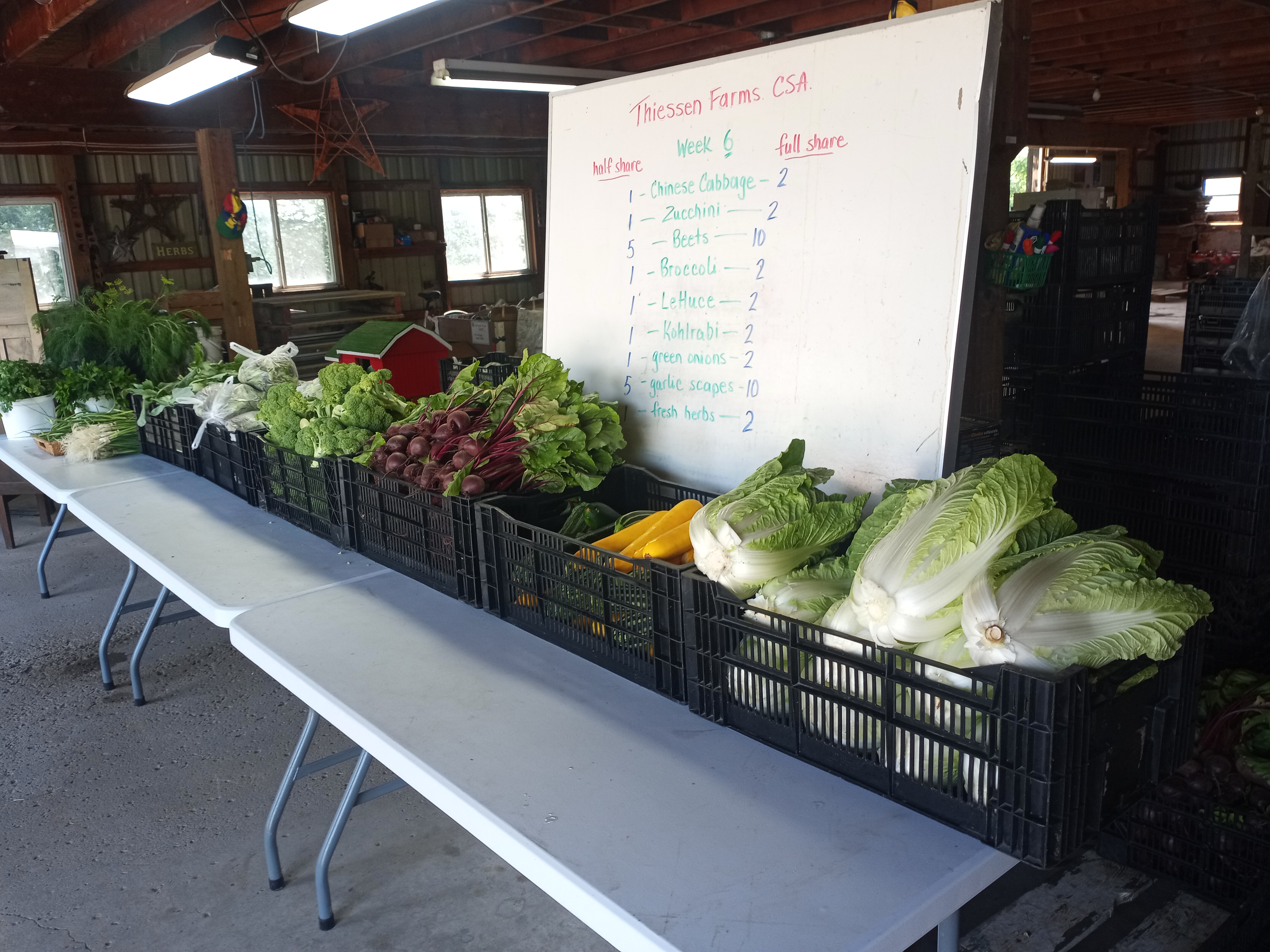 Mini-cabbage, kale bunches, mini-romaine lettuce, zucchini, kohlrabi, green onions, beets.