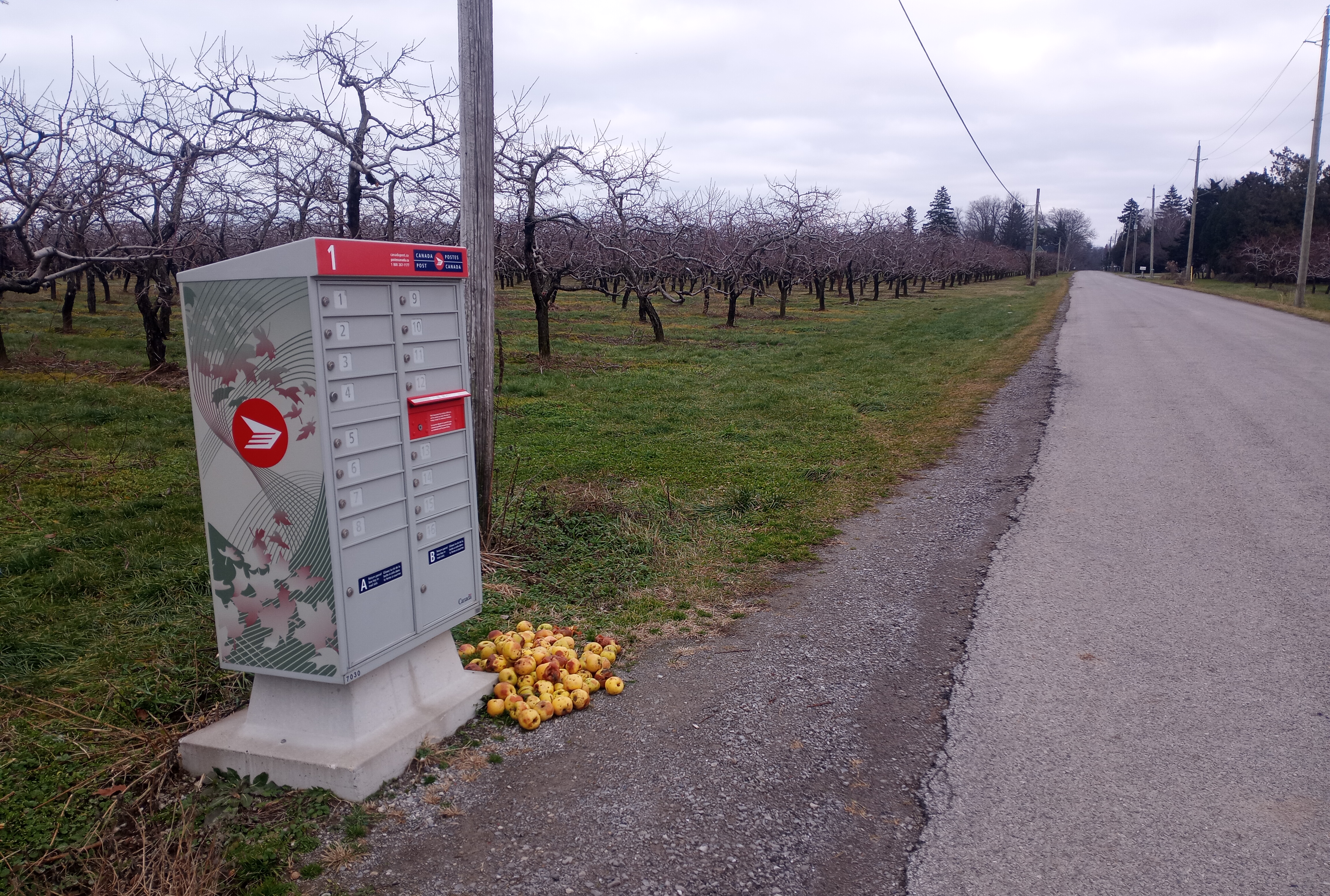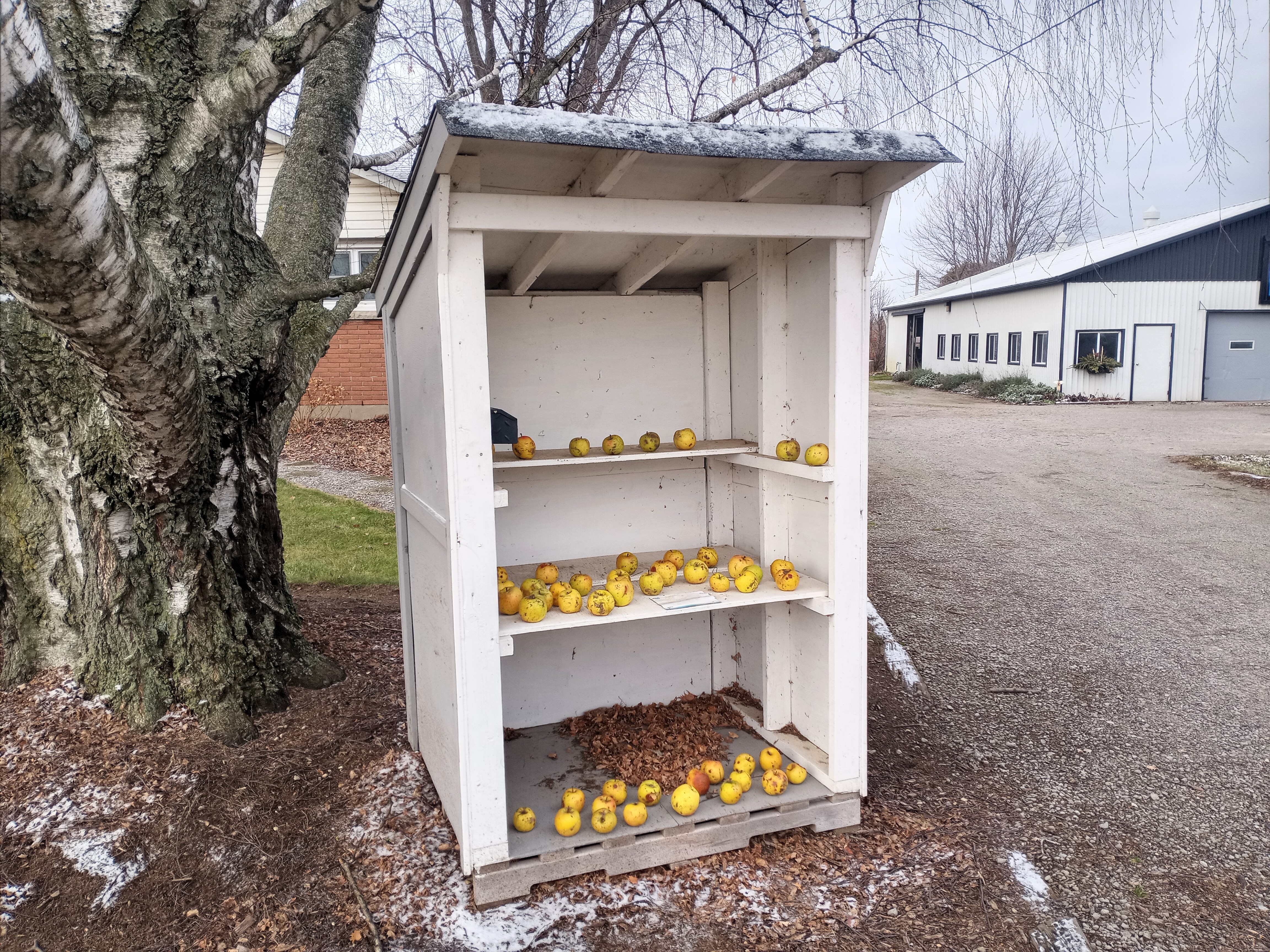 New Year’s Day 2024. Late afternoon – just before dusk. I am curled up in the chair by our front window with a cup of tea. Lorie yells, “Look, it’s the apple guy!” I drop my crossword puzzle. A man is walking up the road. Average looking except for the large orange pail he is hugging to his chest. It seems heavy. (Why isn’t he carrying it by the handle?) He disappears behind the birch tree and our roadside vegetable stand. Several minutes go by. When he reappears he is swinging an empty pail. Crosses the road and stashes the pail under the neighbours’ cedar hedge. Resumes his walk down the road. Whatever. I settle back in my chair and continue the crossword.