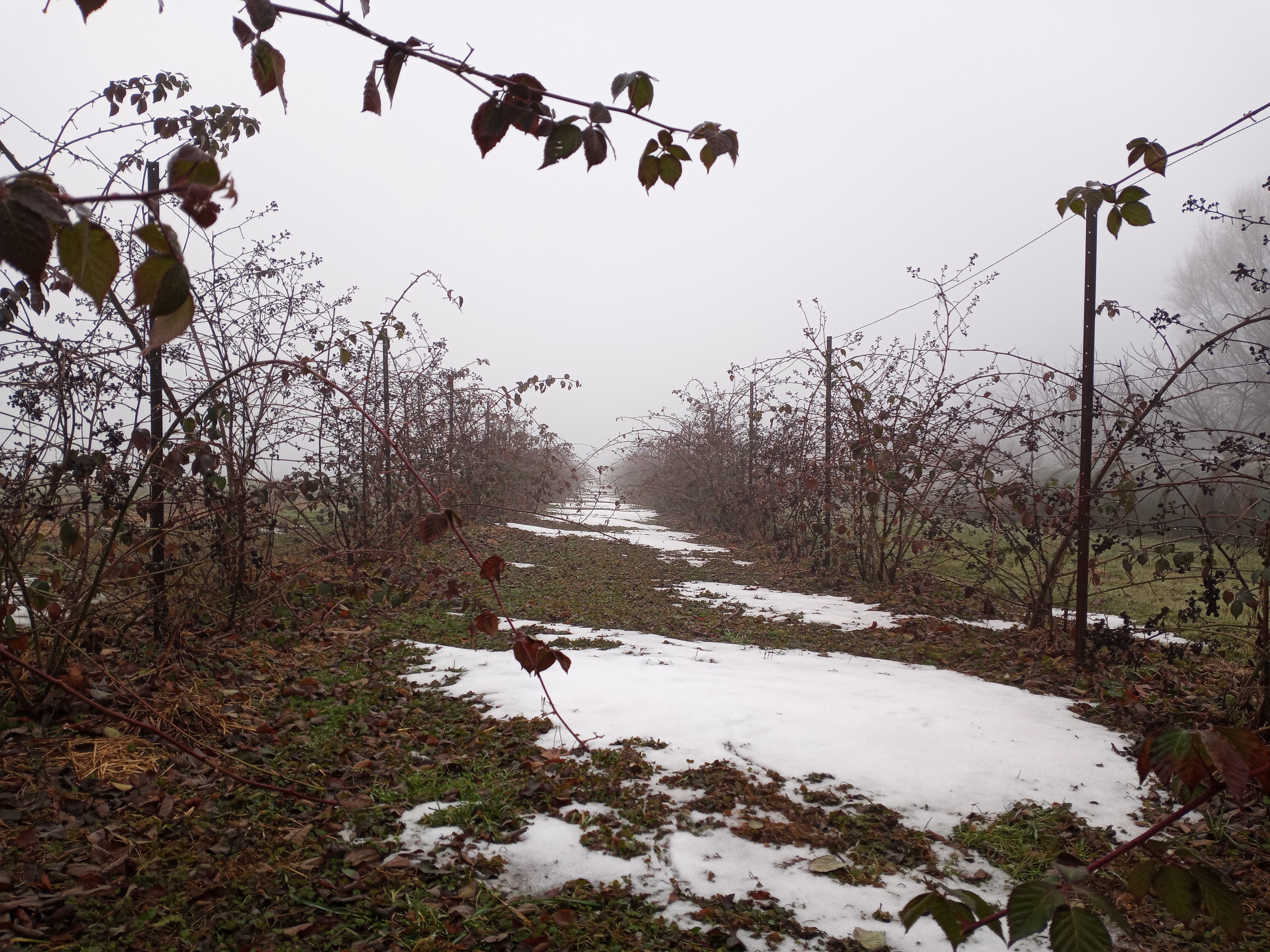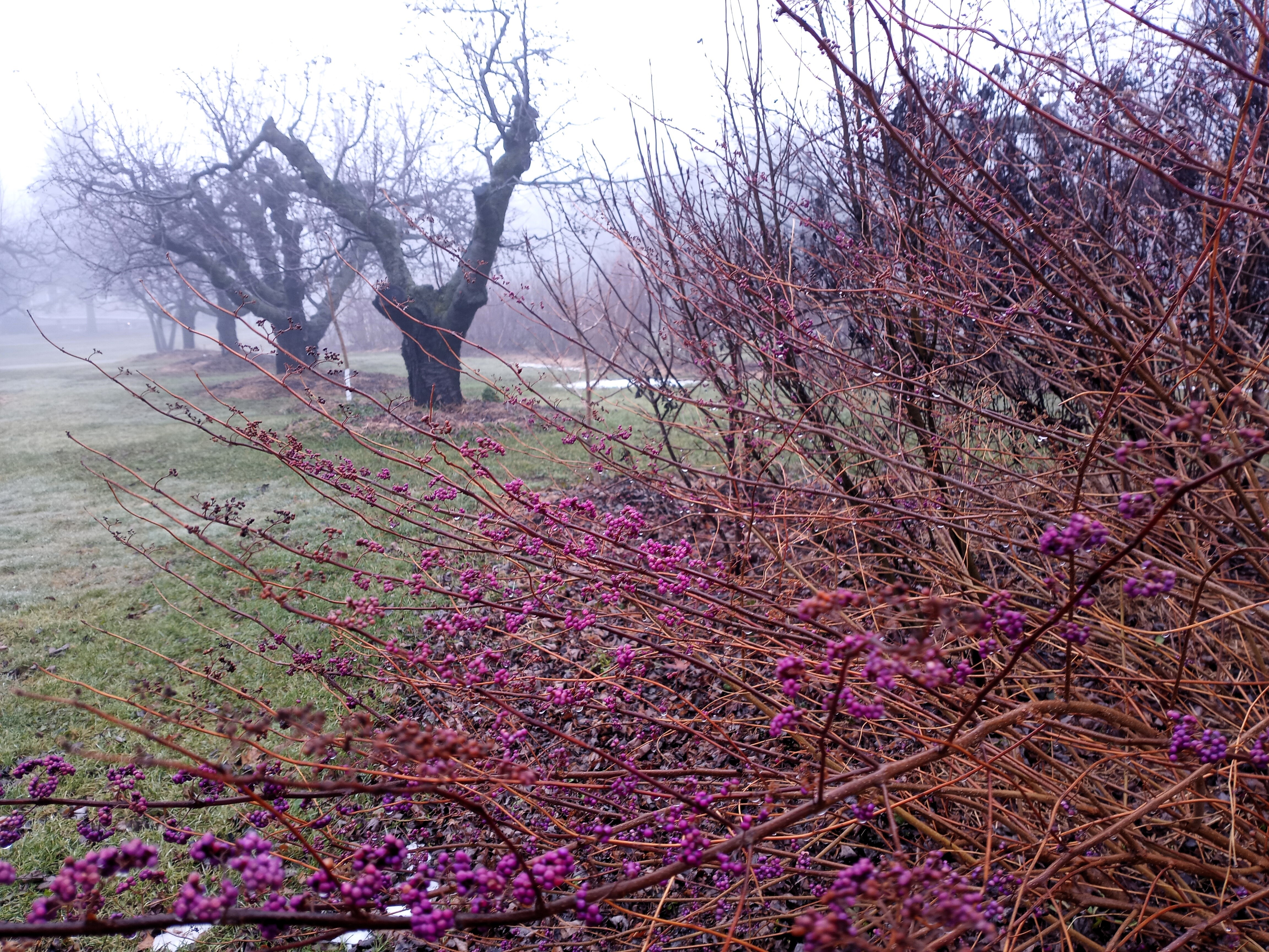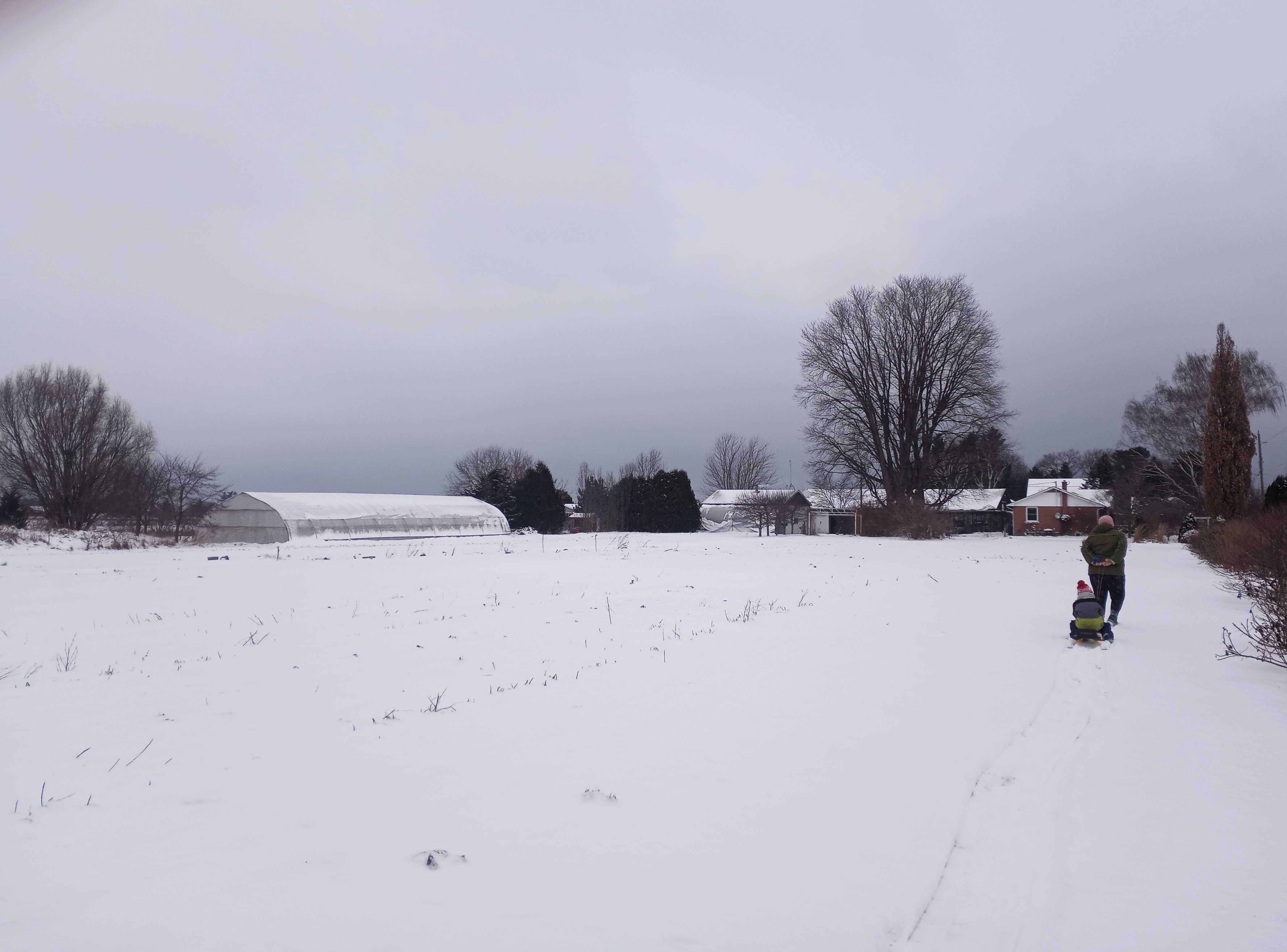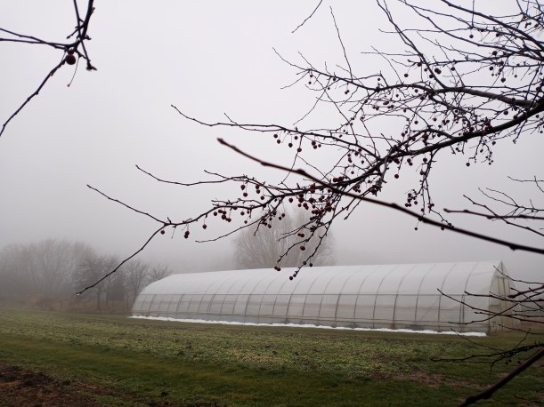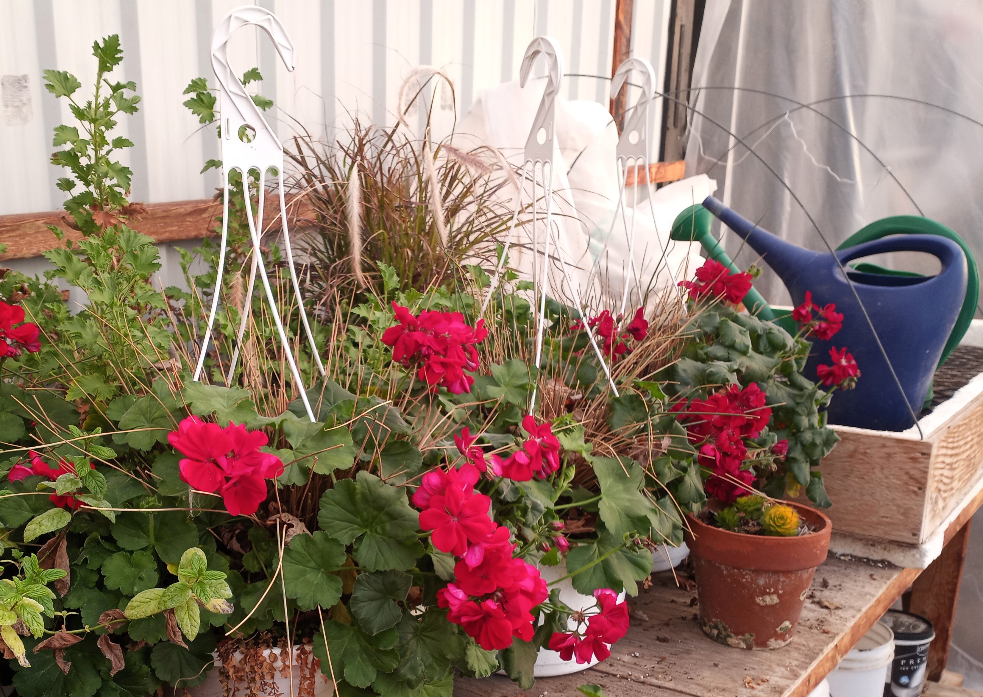 In the little greenhouse there are reminders of last season. Under several added layers of plastic I kept some hanging baskets and some pots of herbs, for early spring cuttings.