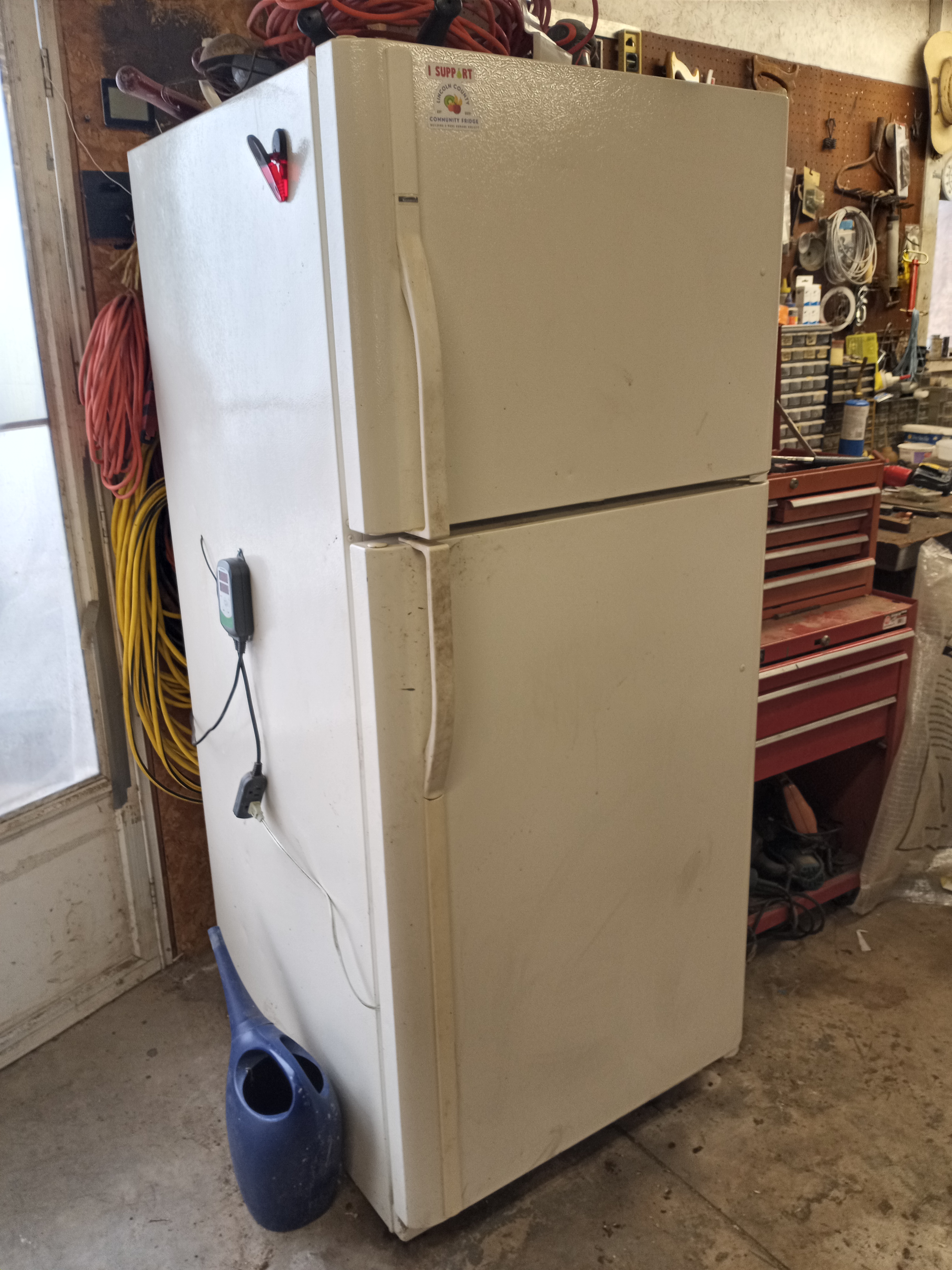 A (non-working) fridge has sturdy shelves to carry the weight of many soil-filled seeding trays and enough insulation to keep the temperature stable. A crockpot filled with water, controlled by a thermostat, provides the necessary warmth & humidity that seeds require for germination. Once the seeds poke through the soil they are immediately moved out of the fridge and into the greenhouse since they require sunlight to grow.