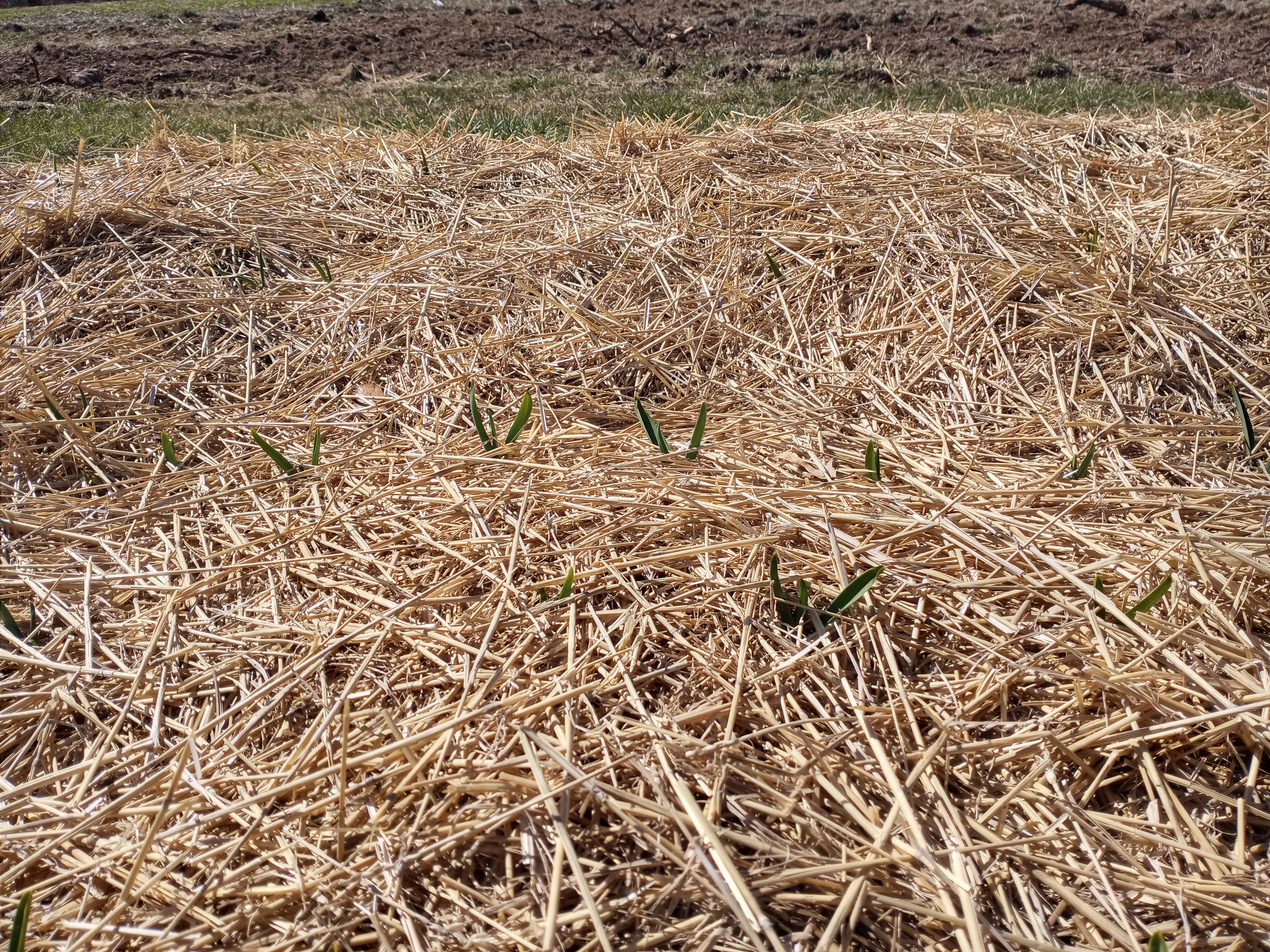 The garlic is just poking through the straw mulch – a sure sign of spring!