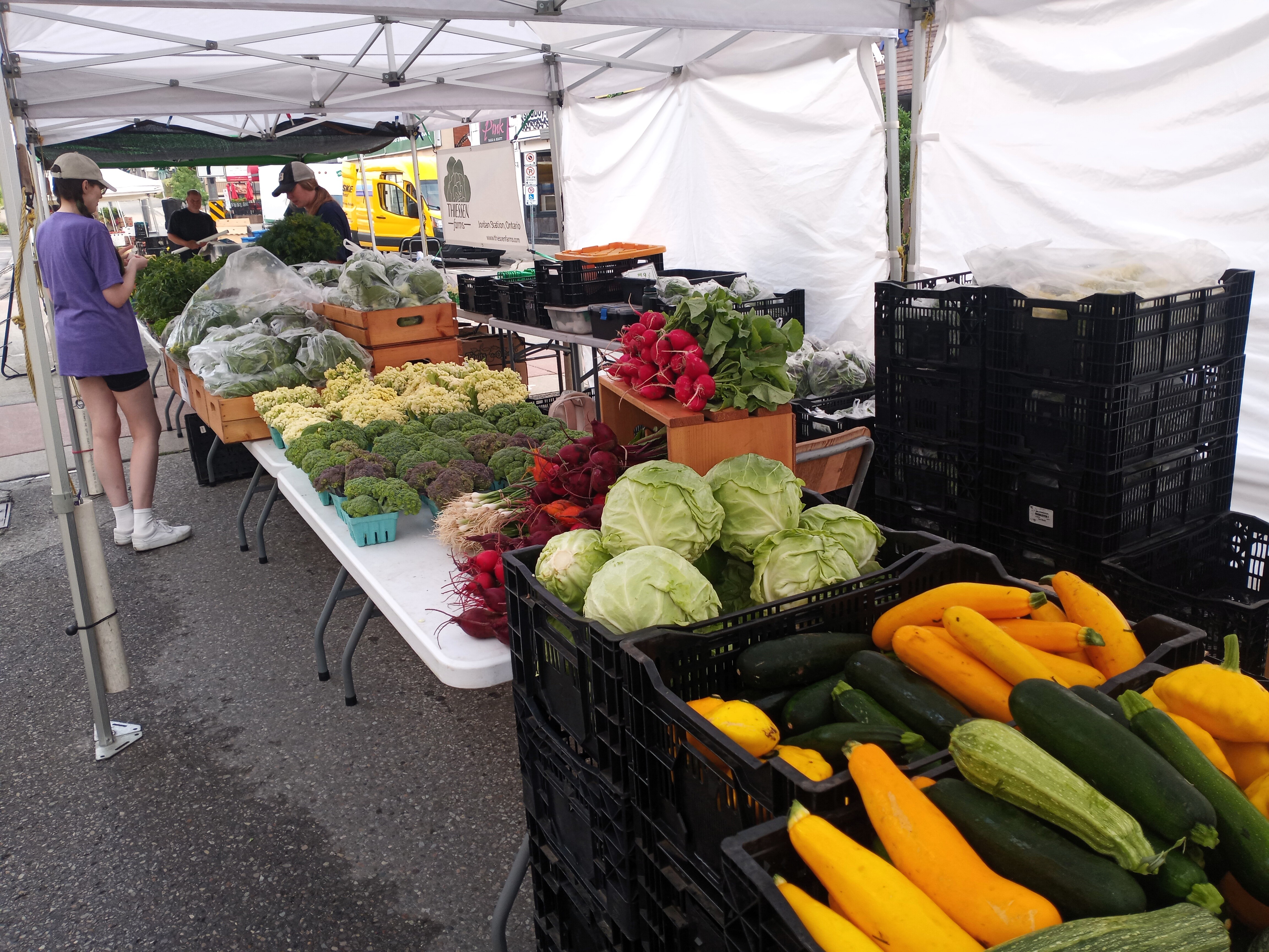 Beets, Chinese (napa) cabbage, mini Romaine lettuce, zucchini, fresh herb bunches, garlic scapes.
