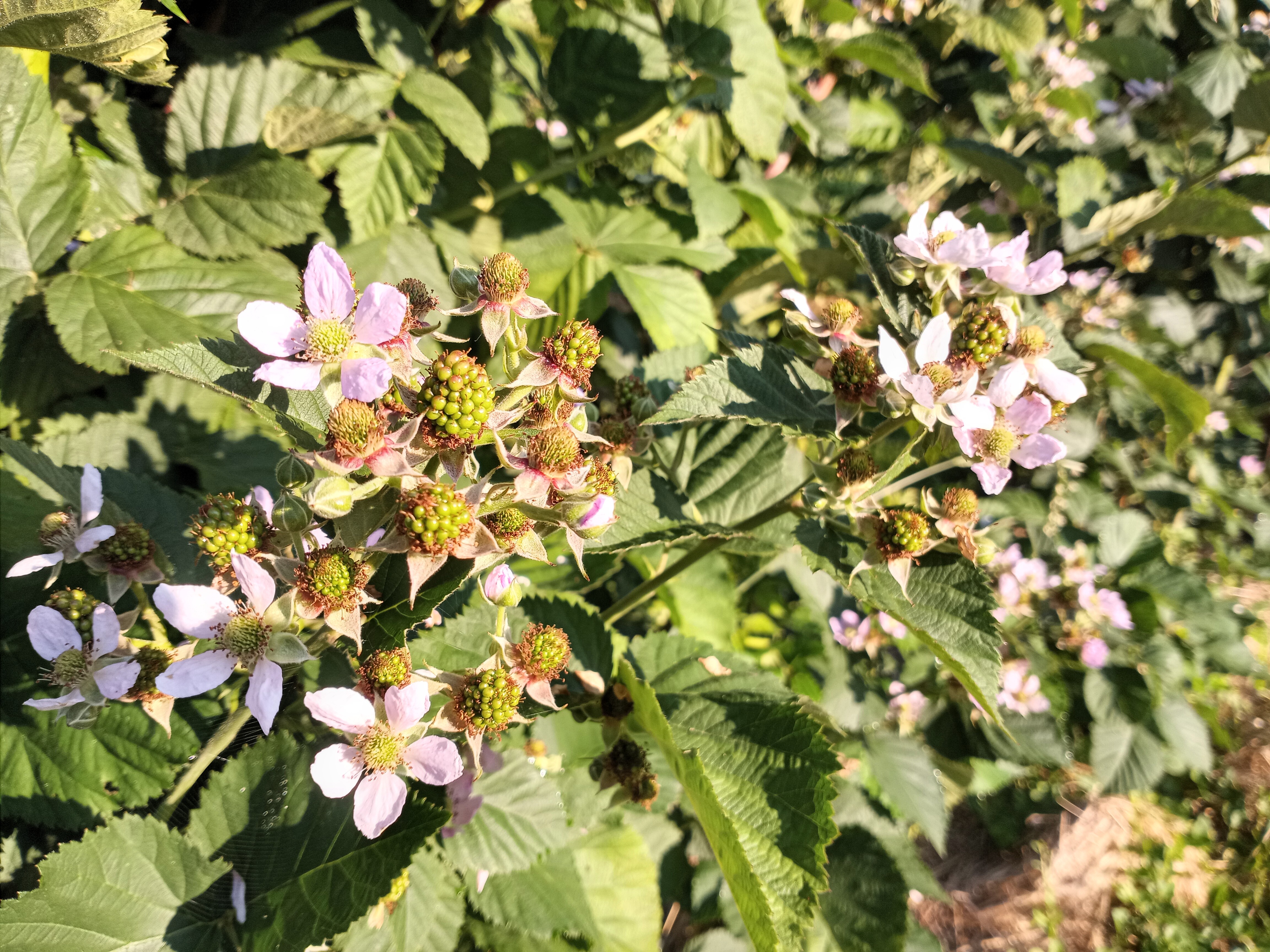 The petals are falling from the blackberry blossoms revealing the little berries.