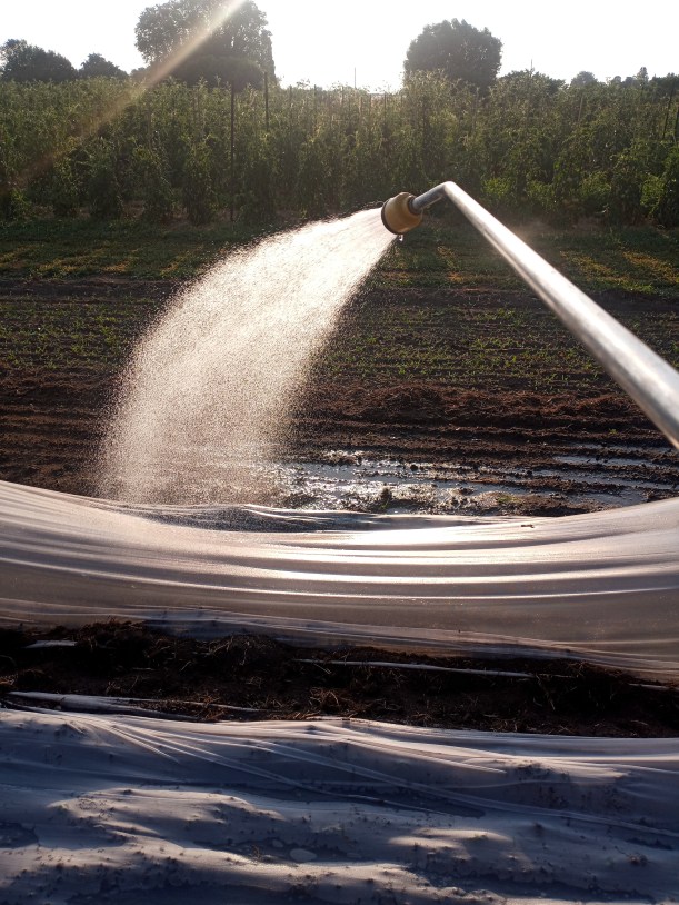 Only newly transplanted vegetables receive water. We water them using our old orchard sprayer with a hose & a water wand. They get water once or twice a day for about a week in this heat. By then their roots are established and they can hopefully survive on their own.