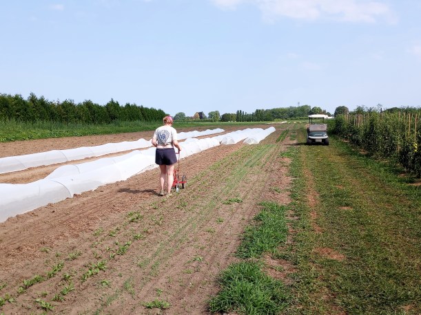 In a season without rain we realize that our efforts to improve our soil are paying off. Our soil holds moisture longer because we have added organic matter with our cover cropping, and use manure & compost instead of chemical fertilizers. We have reduced our tillage, keep the ground covered with something growing most of the time, and use a lot of mulch. Without these measures I know our crops would not be growing as well as they are, and we would be purchasing even more water.