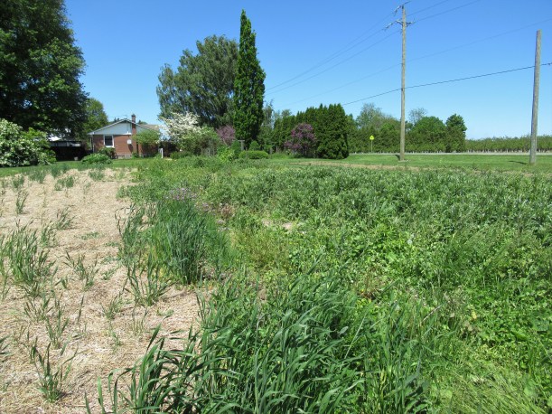If it looks like weeds & thistles, that’s because it is! Most of the herbs didn’t survive the winter. (The loss of all our 50+ lavender plants hurts the most.) While we waited to see if they were merely late in springing to life, the weeds took over. Chaos indeed! And it’s right beside the road so everyone passing by can see. This week finally we dug out the few survivors and then sprayed a herbicide on everything else. I guess that makes us guilty of wanting good (and quick) results without much work, but it seemed the best solution (and one we rarely choose). Shortly we’ll mow everything down & plant a cover crop for the summer to smother weeds & improve the soil. By next spring we can plant vegetables here again.