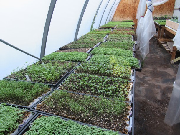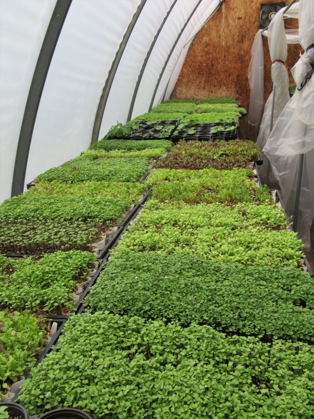 But the frequent rains keep us behind in our seeding & planting. The small greenhouse is bursting with trays of seedlings waiting to be transplanted into the fields.