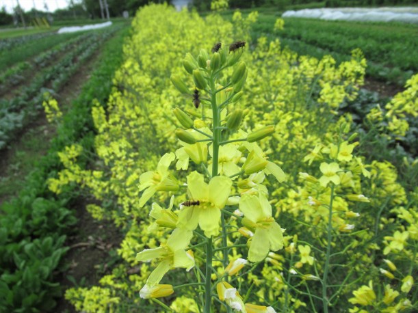 Last year’s row of kale is in full bloom now. On sunny days the plants are vibrating with all the bees working there. On overcast days like today, the flowers are full of other insects & wild bees.