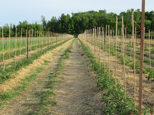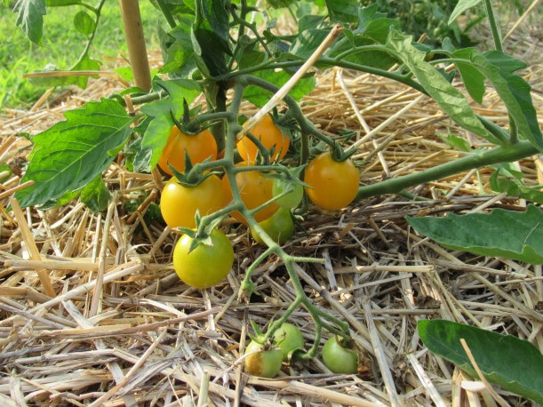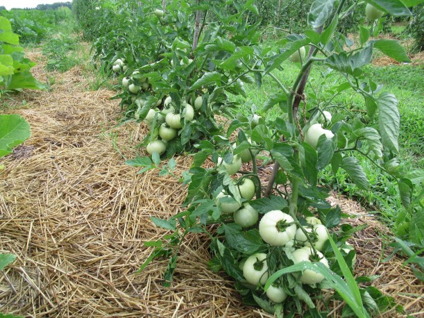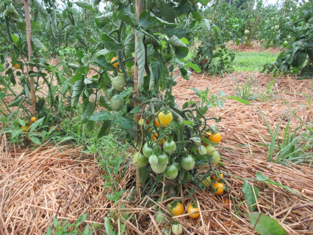The tomatoes, tomatillos and first zucchini are all mulched now and we’re starting to stake the tomatoes.